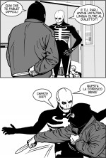 Après avoir incendié l’établissement, Greg prend la fuite, non sans emporter le costume de squelette à l’origine destiné au fils du docteur pour fêter Halloween.