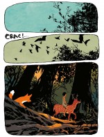 Il est temps d’évoquer plus avant le très beau travail graphique de Terkel Risbjerg : un dessin épuré, simple, proche de la naïveté du personnage central avec des couleurs en aplats, telles qu’on les trouve dans certaines peintures et miniatures médiévales. D’ailleurs, Risbjerg joue avec les codes graphiques temporels, par exemple tous les flash-back sont dessinés sous forme d’enluminures et le fond coloré est différent, entièrement noir, pour les séquences oniriques.