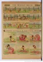 Durant l’année 1910, il a aussi l’opportunité de publier sa seule bande dessinée, un ensemble de strips intitulés « Wigglemuch », dans les pages du New York Herald, au verso du célèbre « Little Nemo » de Winsor McCay. 14 pages, du 20 mars au 19 juin, qui permettront de ne pas complémentent perdre la trace de l’artiste. « Wigglemuch » est l’une des bandes dessinées les plus intrigantes qu’il m’ait été donné de lire. Le Wiggles est une étrange créature aux formes rondes, mix entre un caméléon, une sorte de veau et, mettons, un lémurien, sorti d’on ne sait où, et est l’objet d’un apprivoisement par une bande de personnages à apparence humaine, mais faite de bois, et posée sur des socles, tels des soldats jouets. Ce qui s’apparente dans les premières bandes à une histoire familiale pour enfants s’enfonce rapidement dans un délire surréaliste, où cette créature improbable et non communicante n’est que le prétexte à des rebondissements sans queue ni tête, où seul un texte en prose apporte un semblant de direction avec morale. Si ce qui ressemble à un voyage initiatique, empruntant des chemins défiant tout réalisme, peut faire par moments penser aux rêves de Little Nemo, le non-sens, ou ce qu’il apparaît comme tel, est si poussé que l’on se demande quel message à souhaité faire passer l’artiste. Il apparaît dès lors plus probable que ce qui ressemble à une bande dessinée ne serait en réalité qu’un ensemble de saynètes suivant une sorte de déroulés logique, dans l’esprit seul de Herbert Crowley. Certes, l’on arrive à distinguer un semblant de quête et de parcours, lorsque le Wiggles se retrouve à la recherche de l’oiseau Ding Dong, autre créature apparue la septième semaine, et dès lors résonnera cette comptine, au milieu des vers, souvent descriptifs : « Ding Dong, ça n’a ni queue ni tong, pourtant c’est moi, l’oiseau Ding Dong ». Cependant, cela ne suffira pas à rendre nettement plus compréhensif l’idée globale de l’auteur, si idée il y avait, en dehors d’une écriture automatique. Et ce qui pouvait apparaître comme une bande enfantine, avec ses repères familiers de soldats en bois, de monstres gentils et de multiplicité de personnages (combattant en armures dans la moitié de ce début d’histoire), prend vite la forme d’un drôle de cauchemar, dont on a hâte de s’extirper.
