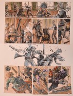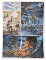 Fidèle à la couleur directe (l’album est aussi disponible depuis le 17 juin dans une luxueuse version noir et blanc, enrichie d’un cahier graphique et limitée à 2 000 exemplaires ; format 26 x 35,9 cm), l’auteur de « La Piste des ombres » (Vents d’Ouest, 2000 à 2002) déploie tous ses talents dès les premières cases, qui soulignent la rudesse des conditions de vie dans l’hiver enneigé du Montana en 1896. Les rhumatismes et les kilomètres parcourus d’un bout à l’autre du ranch afin de surveiller les clôtures ont transformé les anciens pisteurs et vachers en simples gardiens. L’Irlandais McDougall et Ambrosius Morgan en sont les amers représentants, l’auteur n’étant par ailleurs pas dupe vis-à-vis du rêve américain : « J’aime ce XIXe siècle un peu fantasmé, où le rêve américain existait encore. Un pauvre Européen qui venait de traverser l’Atlantique pouvait y trouver quelque chose, y vivre son rêve d’une nouvelle vie, même s’il était très vite confronté à la dure réalité de l’exploitation humaine et du massacre des Amérindiens. J’ai certainement en partie découvert cette époque de grands aventuriers à travers la bande dessinée, notamment « Comanche », « Les Tuniques bleues » ou encore « Blueberry ». Mais je préfère prendre du recul par rapport à cette période. Quand on vit une guerre, on ne se rend pas compte de ce qui se passe, on marche à l’émotion. Dix ans, vingt ans après, on peut en revanche analyser les erreurs ou les abus qui ont été commis. Le protagoniste de « Ghost Kid », Ambrosius Morgan, est un vieux cow-boy ; comme celui de « Buffalo Runner » était un vieux chasseur de bisons qui avait été pistolero dans une autre vie. Grâce à son expérience, Ambrosius Morgan peut faire le constat de ce qui a été vécu. Il a compris que l’ère des cow-boys et des grandes transhumances était terminée. […] »