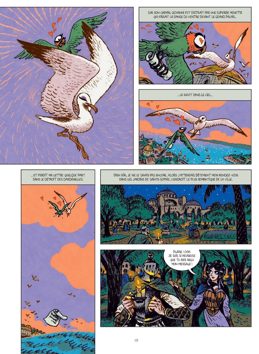 Enfin, il faut insister sur la grande beauté du dessin d’Alexander Utkin. Le Russe, souvent bloqué dans son pays par le contexte international que l’on connait, confirme son exceptionnel talent dans la bande dessinée. Il mise sur la couleur plus que sur le trait pour créer un univers historiquement crédible, lequel peut virer en une case au fantastique, au merveilleux, à la fable… Il a tout compris du découpage dans la bande dessinée moderne. Il peut ainsi passer rapidement d’un décor urbain avec une belle perspective à une case dans laquelle se battent une dizaine de personnages. Son talent révélé dans « La Princesse guerrière : un conte inspiré du folklore russe » et « Le Roi des oiseaux : un conte inspiré du folklore russe » est ici mis au service d’une épopée médiévale unique, disruptive et d’une grande poésie.