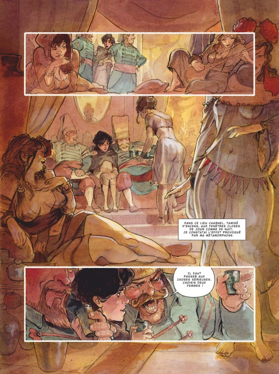Il a pourtant laissé ce soin au talentueux dessinateur qui reprend tel quel le style élégant de l’érudit avocat-écrivain — il y a très peu dialogues — et l’enlumine de son virtuose trait raffiné, tout au long des quasiment 200 pages de ce gigantesque ouvrage de fort belle facture !