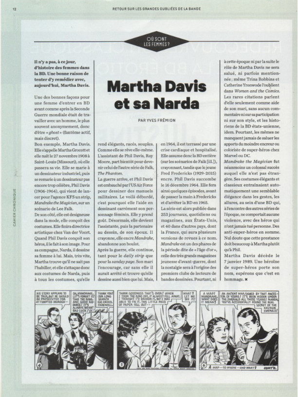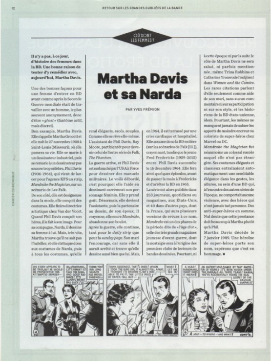 À ces articles, s’ajoutent les chroniques habituelles signées Numa Sadoul (« Les Petites Femmes de Forest »), Yves Frémion (« Martha Davis et sa Narda »), Fleur Hopkins-Loféron (« Festival Gribouillis », entretien avec Tillie Walden), Marius Jouanny à propos de l’avenir incertain d’Angoulême, Aurélien Lemant (décès tout récent de Jim Shooter)…
