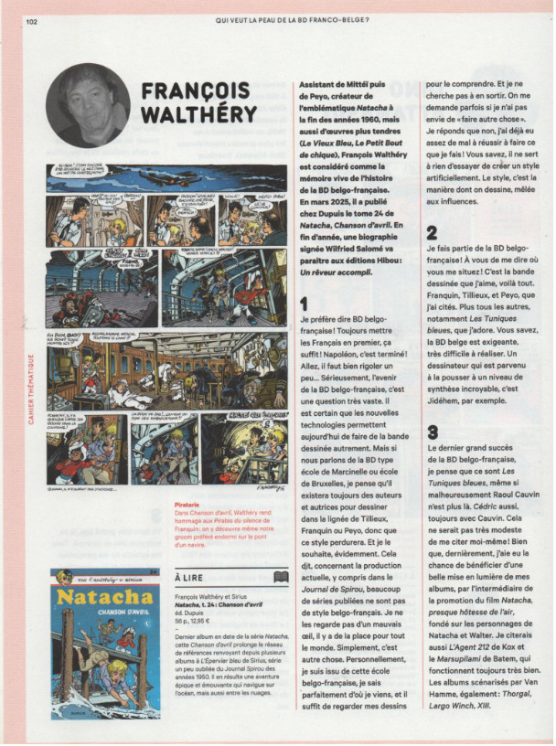 Au fil du dossier, trois questions liées à l’avenir de ladite BD sont posées à cinq auteurs : François Walthéry, François Rivière, Lewis Trondheim, Bastien Vivès et le centenaire Dino Attanasio (1), dont on peut savourer un ancien récit destiné à Tintin dédié à Edgar P. Jacobs.