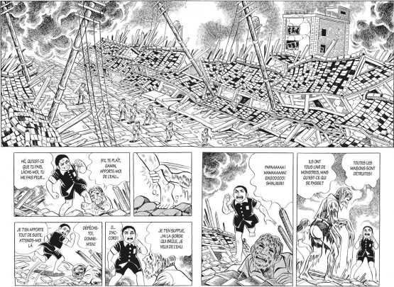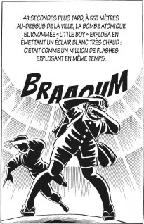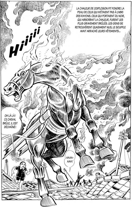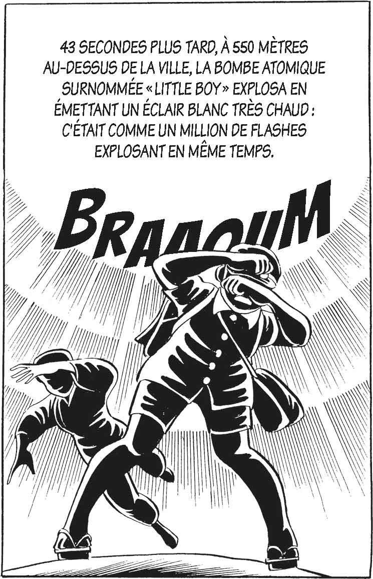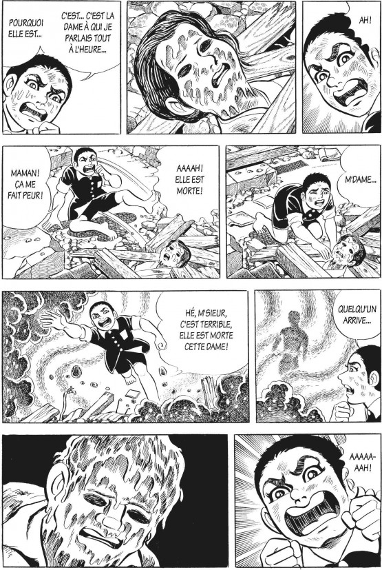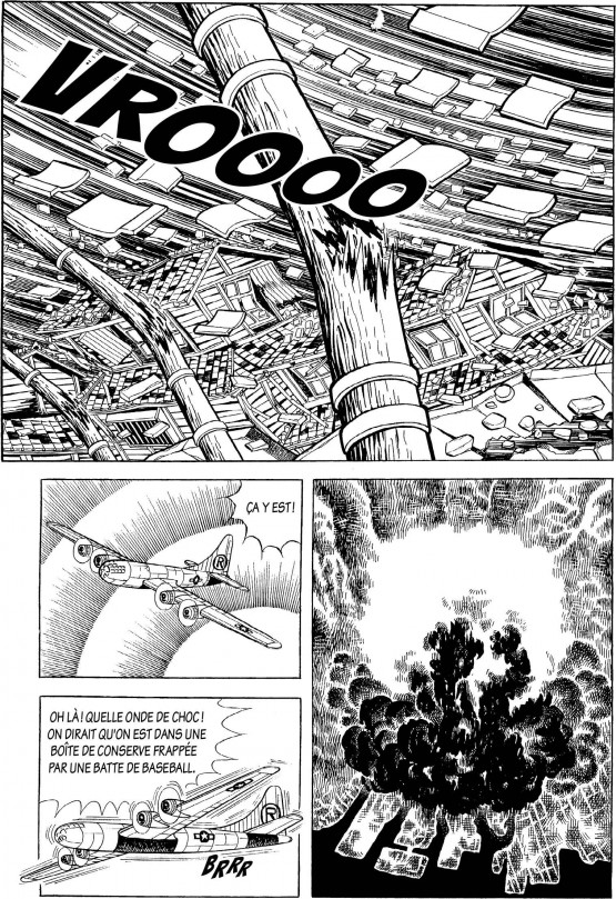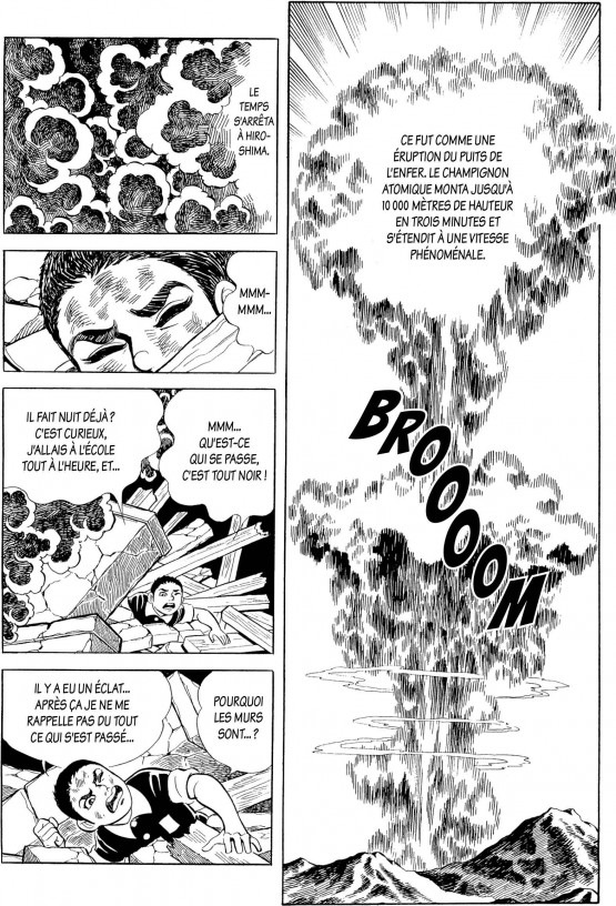Lors de l’explosion de la bombe, dans les dernières pages du premier volume, le récit prend une tout autre tournure et perd d’un coup sa légèreté. Le second tome commence donc dans les ruines d’une ville totalement détruite. Nakazawa n’épargne en rien le lecteur : il dépeint de manière dramatique, mais avec justesse, la vision cauchemardesque du souffle qui a tout balayé. Les corps qui fondent sous l’effet de la chaleur, les bâtiments qui brûlent et s’effondrent, les habitants pris au piège d’une ville rasée qui va devenir leur tombeau, rien n’est éludé. C’est cette violence graphique, inhabituelle pour l’époque dans un manga — même si celui-ci se veut réaliste —, qui donne toute son ampleur à un récit dépeignant, sans fioritures, l’horreur vécue par les humains peuplant cette petite ville japonaise. Cette représentation crue ne sert qu’un seul but : montrer la réalité absolue de l’arme nucléaire pour que personne ne puisse l’oublier.