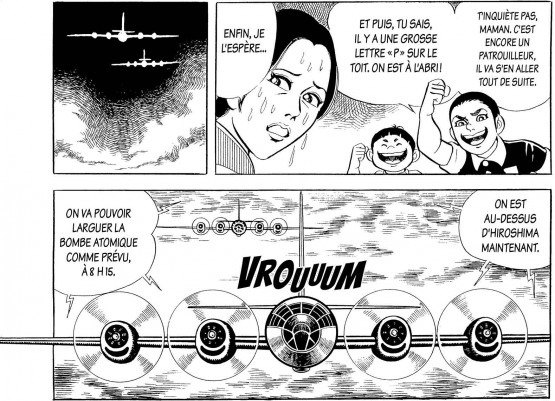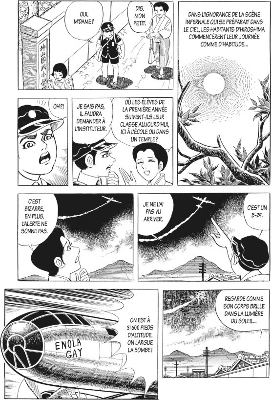 La particularité de cette œuvre réside dans son récit qui n’est pas un simple reportage sur l’instant précis du largage de Little Boy, mais également sur les prémices de la montée du nationalisme japonais et de l’endoctrinement des jeunes dans une guerre inutile, puis des longues répercussions qu’a eues l’utilisation de l’arme atomique sur la ville d’Hiroshima et ses habitants. Cela reste une dénonciation cinglante de la guerre et de la misère qu’elle engendre.