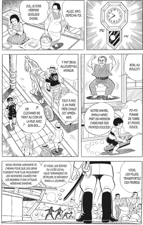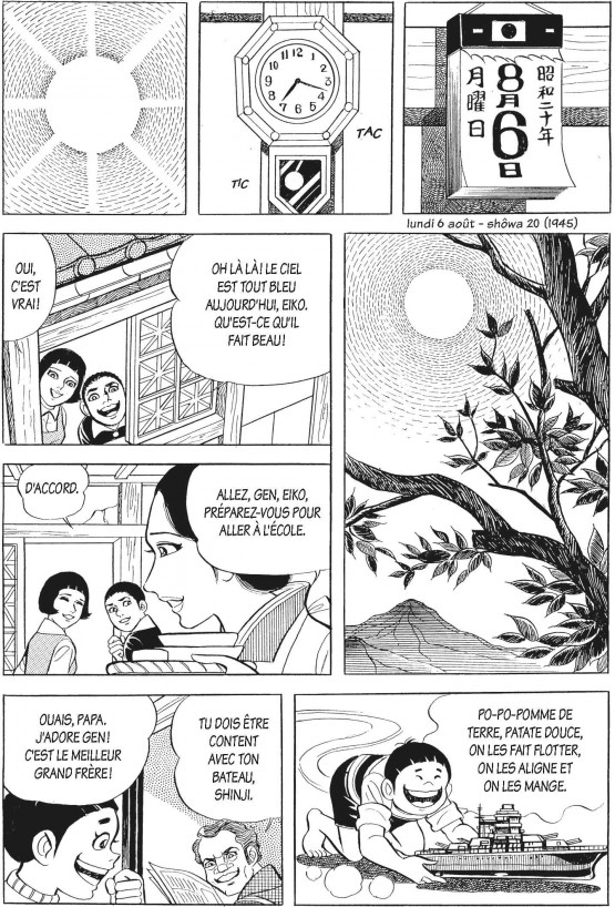 Pour sa première incursion dans l’édition de manga, les éditions du Tripode ont choisi une œuvre emblématique et universellement acclamée pour son message. L’écrin est à la hauteur de leurs ambitions, avec des couvertures sobres qui reprennent une illustration emblématique en noir et blanc rehaussée, pour chaque volume, d’un pavé de couleur différente où figure le titre. Titre qui, pour la première fois, est plus proche de la version japonaise (2) que le simple « Gen d’Hiroshima » des précédentes éditions. À partir de ce mois d’octobre, un nouveau volume sera publié tous les deux mois jusqu’au début de l’année 2027. Sur dix volumes, la vie tumultueuse de Gen va s’étendre de ses six ans en avril 1945 jusqu’à son adolescence en août 1953.