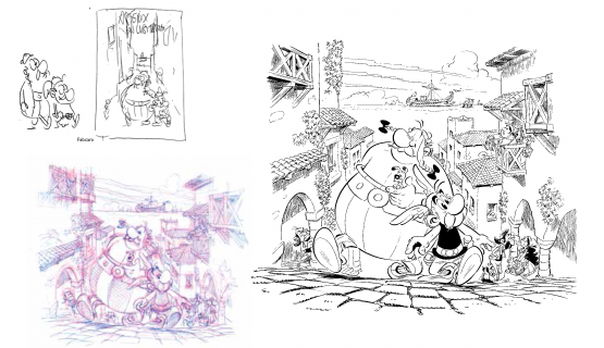 S’enrichissant d’une destination inédite tous les deux titres, la série « Astérix » (initialement baptisée « Une aventure d’Astérix le Gaulois » jusqu’à « Astérix chez les Belges » - le tome 24 – en 1979) ne pouvait décemment plus passer à côté du Portugal : l’ouest de la péninsule ibérique étant plébiscité par de très nombreux lecteurs depuis plusieurs années. Si les auteurs préfèrent réfléchir en termes de scénario et de contenus, voyons toutefois que Fabcaro, à la suite de « L’Iris blanc », avait plutôt envie « d’un album lumineux, aux ambiances baignées de lumière ». Une atmosphère parfaitement traduite au fil des différentes planches, cases et couvertures (promotionnelles ou finalisées) dévoilées ces dernières semaines, lesquelles ont livré quelques précieux indices aux lecteurs : le voyage maritime et la présence romaine, les traditions et spécialités lusitaniennes (vêtements et habitat, carrés de faïences décorés (azulejos) et morues mises à toutes les sauces), le vil antagoniste embusqué (Pirespès) et la personnalité caricaturée (l’humoriste britannique Ricky Gervais, sous les traits du centurion expatrié Nouvelopus) et les clins d’œil aux classiques ou albums précédents. Ce dans la mesure où le premier plat d’ « Astérix en Lusitanie » reprend les cadrages et mouvements de la couverture d’« Astérix en Corse » (T20, 1973), tandis que la typographie du titre renvoie au verdoyant lettrage employé pour ce même album ou pour « Astérix chez les Pictes » (T35, 2013).