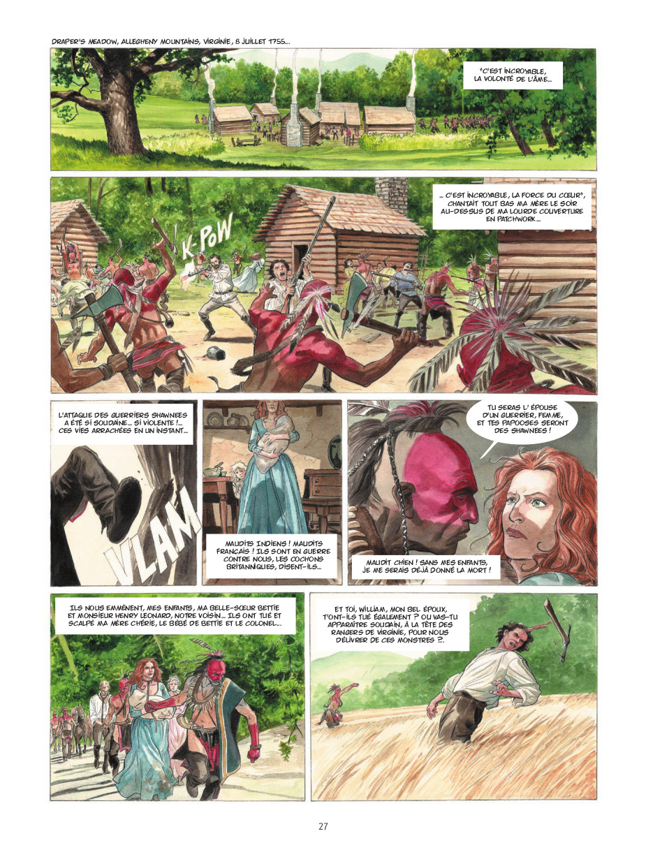 Sans oublier la maestra qui a réalisé la couverture : Béatrice Tillier, brillante autrice s’il en est. Fille spirituelle de François Bourgeon sur le plan graphique, Béatrice Tillier n’a pas son pareil pour illustrer affiches et couvertures. Réaliste, son trait fouillé à l’extrême y fait mouche, accompagné par un délicat chromatisme. Ici encore, sa rousse « cow-girl », duale entre maternel et masculin, impose sa figure dominatrice par son attitude même, par son regard déterminé, par la tenue d’une mâle carabine en main. « Qui s’y frotte, s’y pique», semble-t-elle dire à qui s’attaquerait à son bébé.