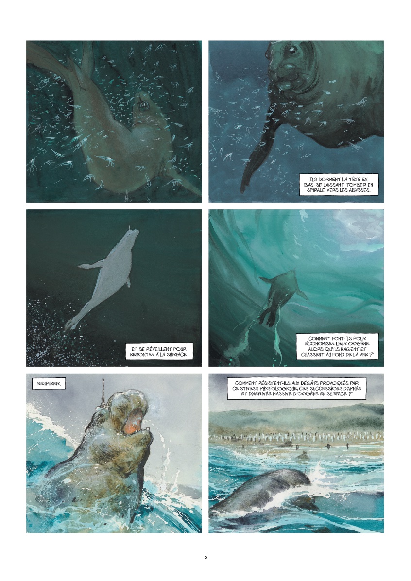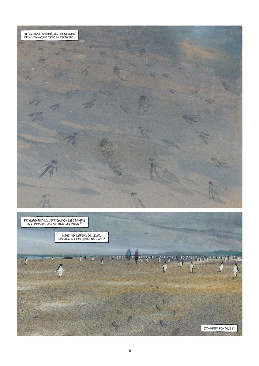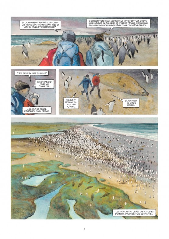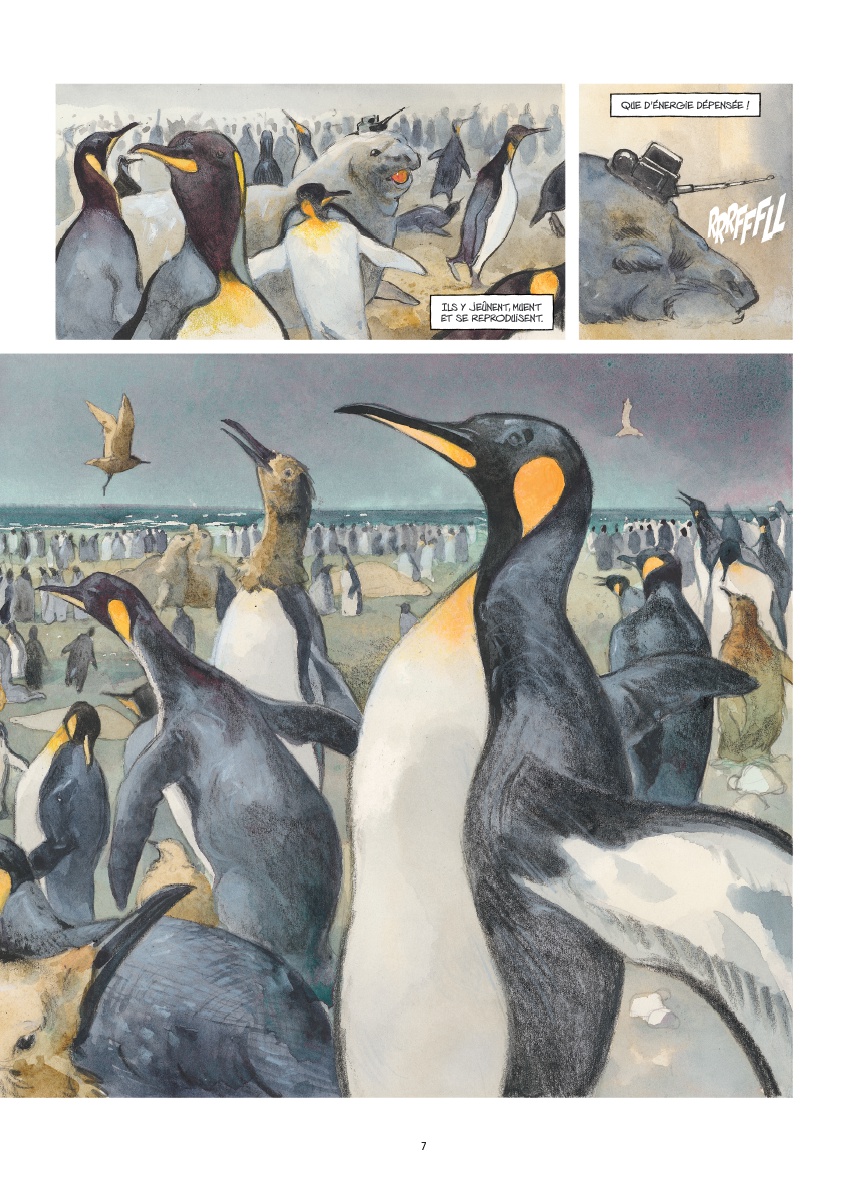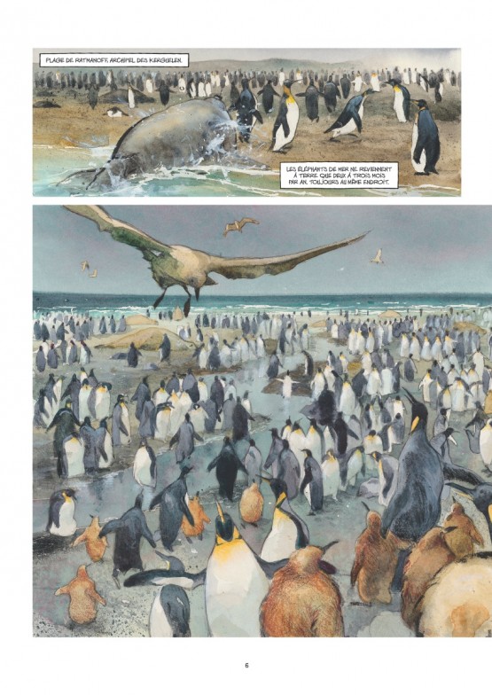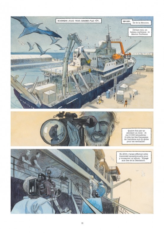 Invité par Christophe Guimet, le responsable des programmes éléphants de mer, pour rendre compte de leur mission dans les îles Kerguelen, le dessinateur de « Muchacho », de « La Terre sans mal », des « Voyages d’Ulysse » ou de « Cache-cache bâton », grand voyageur devant l’éternel, accepte alors, sans se faire prier, d’embarquer une nouvelle fois à bord du Marion Dufresne, direction les terres australes.