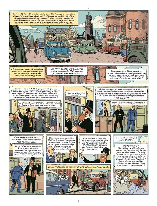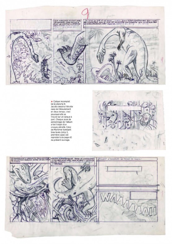 « De toute évidence, Jacobs voulait nous décrire un monde « éco-responsable » (par opposition à sa vision du futur de la planète Terre à la fin du « Piège diabolique »… qui lui vaudra quelques années de censure en France, comme nous le savons). Là aussi, je me suis dit que ces thèmes étant plus actuels que jamais : il fallait les poursuivre en les mettant au goût du jour pour mieux parler au public de 2025. Le but étant toujours de réactualiser le mythe jacobsien, en offrant des nouveautés à la fois « respectueuses ET modernisantes ». Pour l’anecdote, il m’est arrivé la même mésaventure qu’à Jacobs. Vous le savez sans doute, pour « L’Atlantide », Jacobs avait en tête un album beaucoup plus long, où il aurait pu exploiter toutes les ressources (si je puis dire) de son récit. Il suffit de regarder le narratif d’entrée de la première page pour comprendre qu’il a du sérieusement sabrer sur les prémices. Ensuite, on voit qu’il a été obligé d’en venir aux quatre bandes par pages avec 12 à 14 cases par page et des textes très imposants, alors que dans « La Marque jaune » qui avait précédé, il nous offre souvent des dessins sur trois bandes avec des dialogues plus ramassés et moins explicatifs. Pourquoi? Parce que, si j’ai bien été informé, l’éditeur de l’époque lui a demandé de faire un seul album (les diptyques sont plus difficiles à vendre et à gérer en réassort) et qu’il lui a fallu « ramasser » son propos. Curieusement (alors que je me préparais à la suite de cet album mythique), il m’est arrivé exactement la même mésaventure. Lorsque j’ai présenté mon plan de diptyque à l’éditeur, il m’a dit que l’histoire était très bien, mais qu’il se méfiait des récits en plusieurs albums pour les raisons sus-citées et que je comprends fort bien. J’ai donc pris mon courage à deux mains et j’ai reformaté le tout un seul album… avec la densité naturelle qui accompagne ce genre d’opération. C’est après coup que je me suis dit que c’était peut-être une sorte de « signe du destin ». De ce fait (et grâce au grand talent de Peter Van Dongen, of course), le résultat est extraordinairement proche de l’album de Jacobs sur le plan visuel global. Quand j’ai vu arriver certaines planches de Peter, j’ai vraiment eu l’impression de découvrir une nouvelle planche inédite de Jacobs dans « L’Énigme de l’Atlantide. Vraiment. À ce moment, je me suis dit que les choses s’étaient bien mises « naturellement ». Et tant pis pour ceux qui se plaindront d’une abondance de texte. Le « genre jacobsien » est fait depuis toujours pour des gens qui aiment lire et je l’assume. »