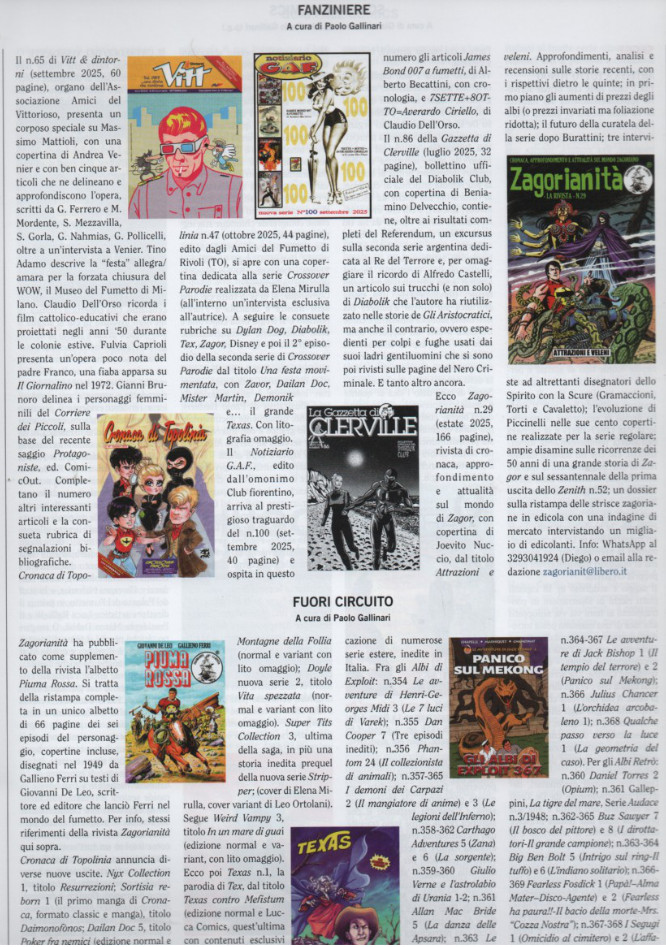 Notons aussi un portrait de Chris Ware par Luca Raffaelli, un article sur les recettes de cuisine en BD, une étude de la brève revue Comics Rama, la première partie d’un article de Roberto Satti sur les cartes postales des fumetti et de la BD, un coup de chapeau aux 40 ans de notre ACBD nationale (Association des critiques et journalistes de bande dessinée) par Bruno Caporlingua, sans oublier les critiques des nouveautés, la rubrique des fanzines…