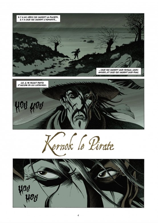 Avec ses crimes, ses tempêtes, ses abordages, ses révoltes et ses âmes égarées, l’univers de « Kernok le pirate » n’est que le reflet de son protagoniste, hanté par l’annonce initiale de sa mort prochaine. La sorcière de la baie bretonne de Pempoul dit-elle vraie ou non ? Nul ne le sait, ni la belle et délicate Mélie, amante de Kernok, ni le mousse Grain-de-sel ni le second Zeli ; mais le couperet demeure menaçant, superstition oblige. Or, cette véritable épée de Damoclès prédictive détermine tout le reste. Kernok, en effet, n’aura de cesse de promener sa noirceur d’une vague à l’autre, avec une amertume cynique devenue de plus en plus jubilatoire ! Échappera-t-il pour autant à son macabre destin ?