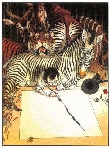 Il collectionne aussi les livres sur les animaux et il lui arrive, très souvent, de visiter les jardins zoologiques ; d’ailleurs, la première case de sa première bande dessinée, réalisée à l’âge de 14 ans, représente l’entrée d’un zoo.