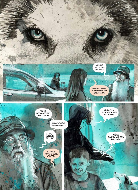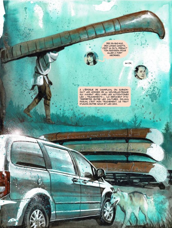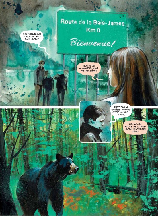 Voilà l’histoire d’une « transmission » en Baie-James. Mais de quels « héritages » nous parle-t-on, au juste, à propos de cette région du Québec ? C’est évidemment ce qui incite à découvrir ce titre – longuement présenté en quatrième de couverture, ce qui n’est pas inutile du côté européen de l’Atlantique -, tout autant, qu’en le feuilletant, la beauté des dessins de Christian Quesnel…