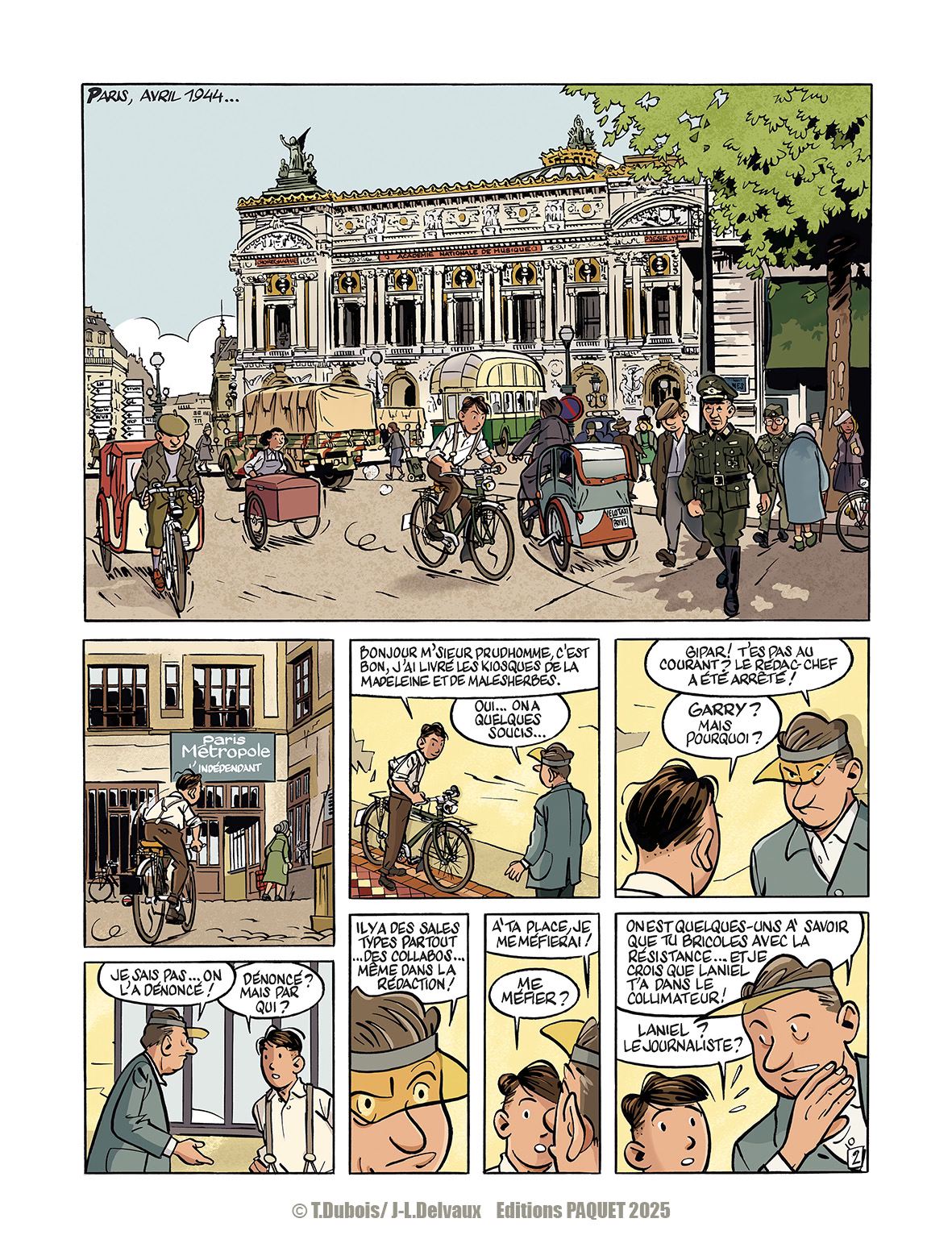 Un moment à part, suspendu, dans l’aventureuse carrière du journaliste d’investigation de France Enquêtes. Une silhouette féminine entraperçue le plonge dans ses souvenirs de la guerre qu’il a vécu adolescent : par hasard, le voilà contraint de quitter sa mère et Paris en catastrophe pour sauver une enfant juive, dont les parents viennent d’être raflés. À pied, en train, en voiture, en camion, en autocar, en carriole à cheval… Jacques Gipar et Sarah Cohen progressent vers la ligne de démarcation : périple mouvementé, semé d’embûches et de belles ou de très moches rencontres, qui mènera l’enfant et le jeune homme jusqu’en août 1944 et jusqu’en Provence. On sait que Thierry Delvaux raconte passionnément les routes de France des Trente Glorieuses et que Thierry Dubois les illustre de vieilles mécaniques, de trognes impayables et de frais minois. Ils ont su, ici, se glisser avec habileté dans une tendance actuelle de la bande dessinée : les aventures d’enfants pendant la Deuxième Guerre mondiale.