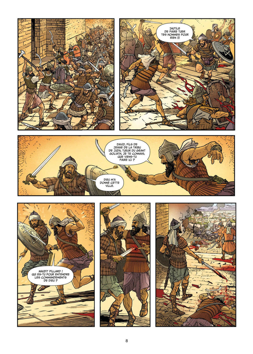 Lorsque le roi David prend Jérusalem avec ses soldats, la ville n’est encore qu’une bourgade, dénommée Jébus. Il en fera sa capitale — une cité pour tous les Hébreux — sous le nom de Jérusalem et y fera transférer l’Arche d’alliance. Il prend pour nouvelle épouse la belle Bethsabée, mariée à un général hittite que David fait tuer au combat. Il aura plusieurs fils, mais l’aîné, Absalon, se retournera contre lui pour tenter de prendre le pouvoir. David aura un autre fils, Salomon, qui achèvera le rêve de son père en bâtissant un palais, à la fois temple et citadelle : mais violences et guerres sont à venir sur cette terre en partage… Dessins amples, reconstitution minutieuse et style réaliste rendent la mise en scène de cet album saisissante : un régal pour l’œil. On en apprend beaucoup sur ces temps anciens, sur l’un des grands berceaux de nos civilisations et sur la ville sainte des trois religions du Livre. Il s’agit du premier tome d’une trilogiequi promet d’être passionnante !