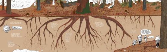 En 20 chapitres passionnants et amusants, des lecteurs dès dix ans peuvent se sensibiliser à la richesse et à la fragilité de l’écosystème forestier. Quatre petits animaux anthropomorphes aux caractères définis (Castor, Rat, Orni et Renarde)passent leur week-end à explorer la forêt avoisinante. Le jeune peut aisément s’identifier à l’un des héros pour en apprendre beaucoup sur la faune ou la flore, mais aussi les champignons, les phénomènes naturels, les différents types de forêts ou les grandes étapes de l’histoire de la Terre. Que ce soit au Rotring ou à l’aquarelle, Gaëlle Alméras compose de jolies planches avec des vues forestières détaillées. Humour et érudition se marient sans effort, notamment dans de beaux panoramas à déplier. De quoi en apprendre beaucoup sur le monde arboricole (la partie documentaire bénéficie de la relecture de deux botanistes et médiateurs scientifiques), tout en s’amusant des chamailleries despersonnages : de la bonne et saine vulgarisation !