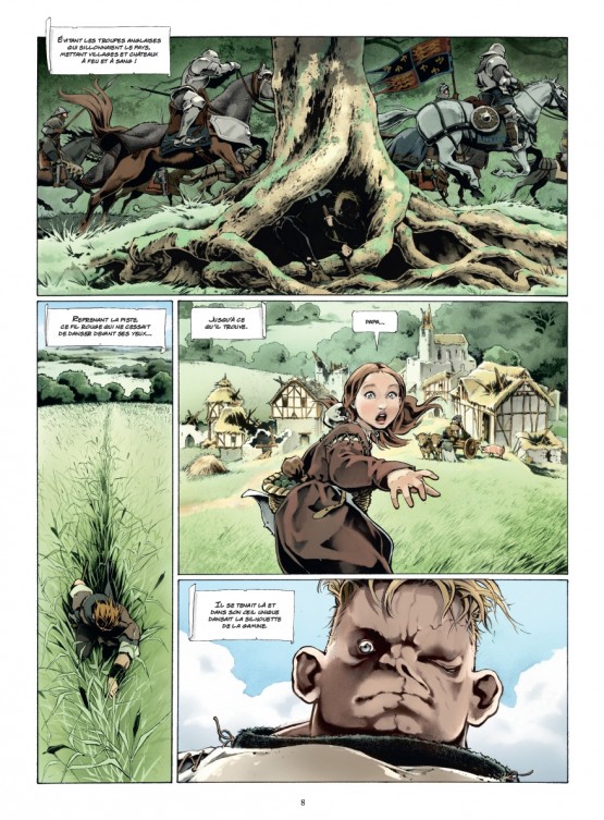 1427 : Un tueur affamé hante les campagnes d’une France ravagée par la guerre de Cent Ans, massacrant femmes et enfants. Jusqu’au jour où sa route croise celle de Jeanne d’Arc, laquelle ne craint ni sa laideur ni son goût pour les carnages. La créature, surnommée l’Ogre et traquée par les troupes royales, protège la jeune femme qui fait route vers Chinon — afin de rejoindre le dauphin Charles VII — et, après avoir mis genou à terre, suit Jeanne jusqu’à sa fin tragique. Au fil de ce thriller historique, Jean Dufaux revisite les années sombres de la guerre de Cent Ans, tout au long d’un diptyque fascinant dont ce premier volume de 112 pages mérite votre attention. Juan Luis Landa, le dessinateur espagnol du remarquable « Arthus Trivium », propose des pages lumineuses aux scènes de bataille qui sentent la sueur et le sang. L’album est élégant, doté d’une double illustration sublime en couverture.