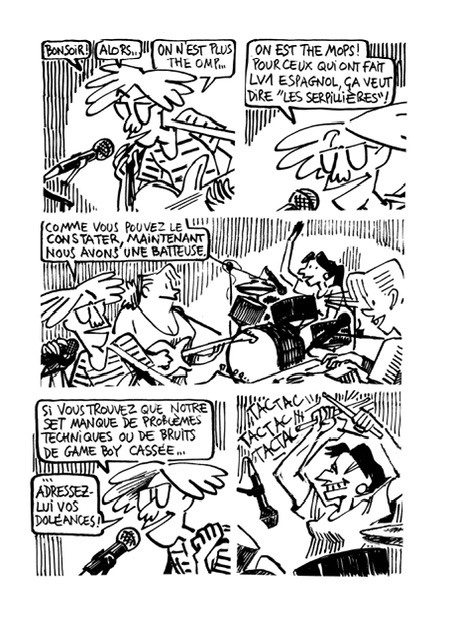 Le duo est rapidement rejoint par Marc, pianiste. Poussés par l’envie de jouer en public, les musiciens organisent leurspremiers concerts. La formation se complète avec l’arrivée de Stéph à la batterie. Les motivations et les désirs de chacun marqueront la destinée du groupe. Quand Otto T., venu du fanzinat et de l’édition indépendante, rencontre le scénariste Daniel Selig, musicien dans différents groupes, ils se rendent compte que les dynamiques de ces deux modes d’expression sont sensiblement les mêmes. Ce sera la base de l’album « The Mops » : le portrait d’une scène indépendante vivante où règne la sincérité de la création et l’esprit du Do It Yourself, quintessence de l’esprit rock.