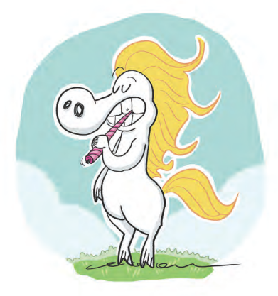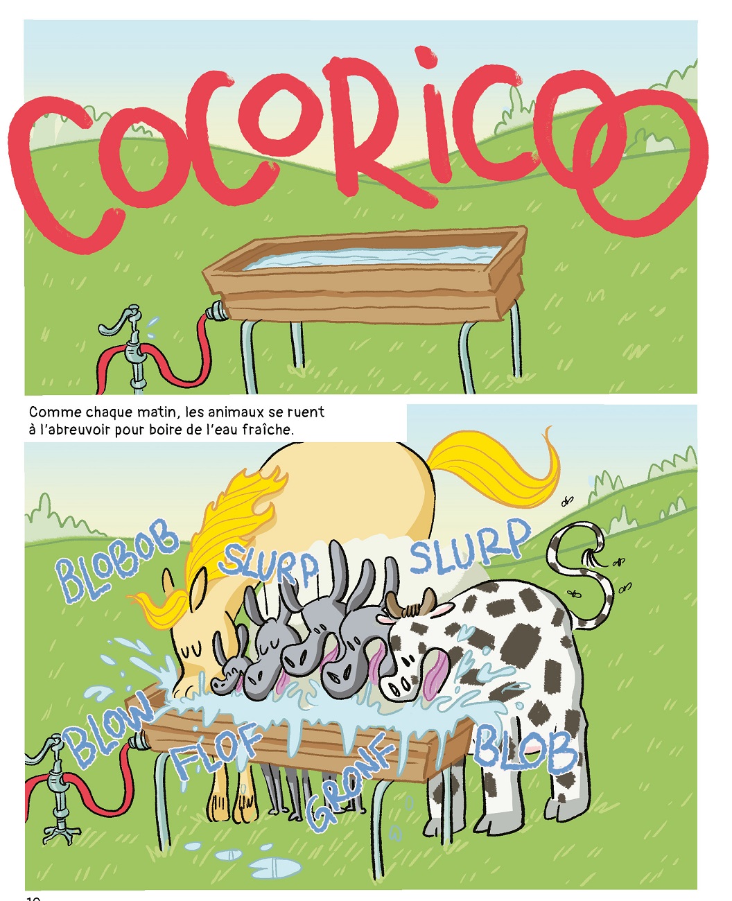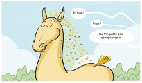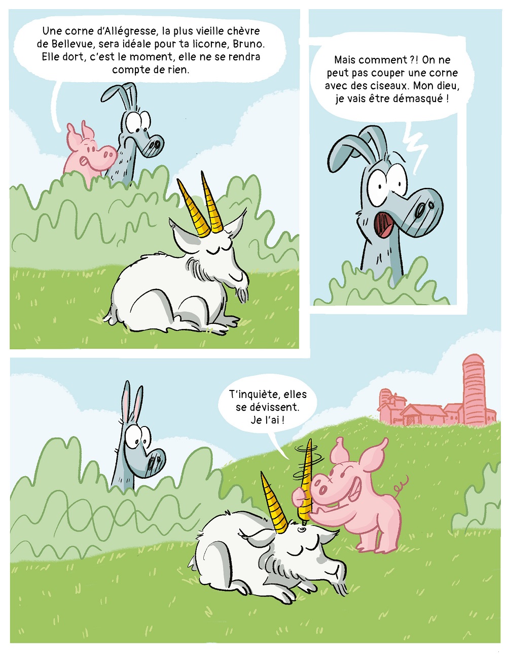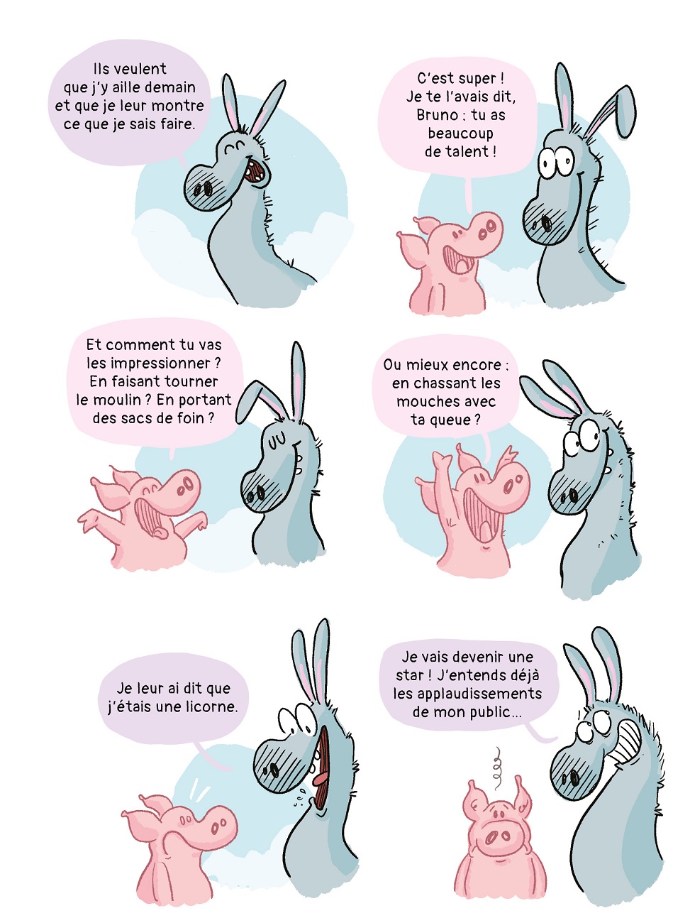 C’est la petite truie Camélia qui le sauve d’un désastre annoncé. Beaucoup plus humble que son ami, ce qui la rend heureuse c’est simplement de manger des glands et faire des siestes au soleil ; mais, rusée elle trouve un stratagème pour que Bruno réalise son rêve. Elle lui fabrique un costume idoine avec la magnifique crinière de la jument de la ferme, une corne d’allégresse dévissée de la tête de la plus vieille chèvre du troupeau, un peu de peinture blanche, une pointe de maquillage et voilà qu’apparait Bourricorne : la licorne future star de la piste aux étoiles.
