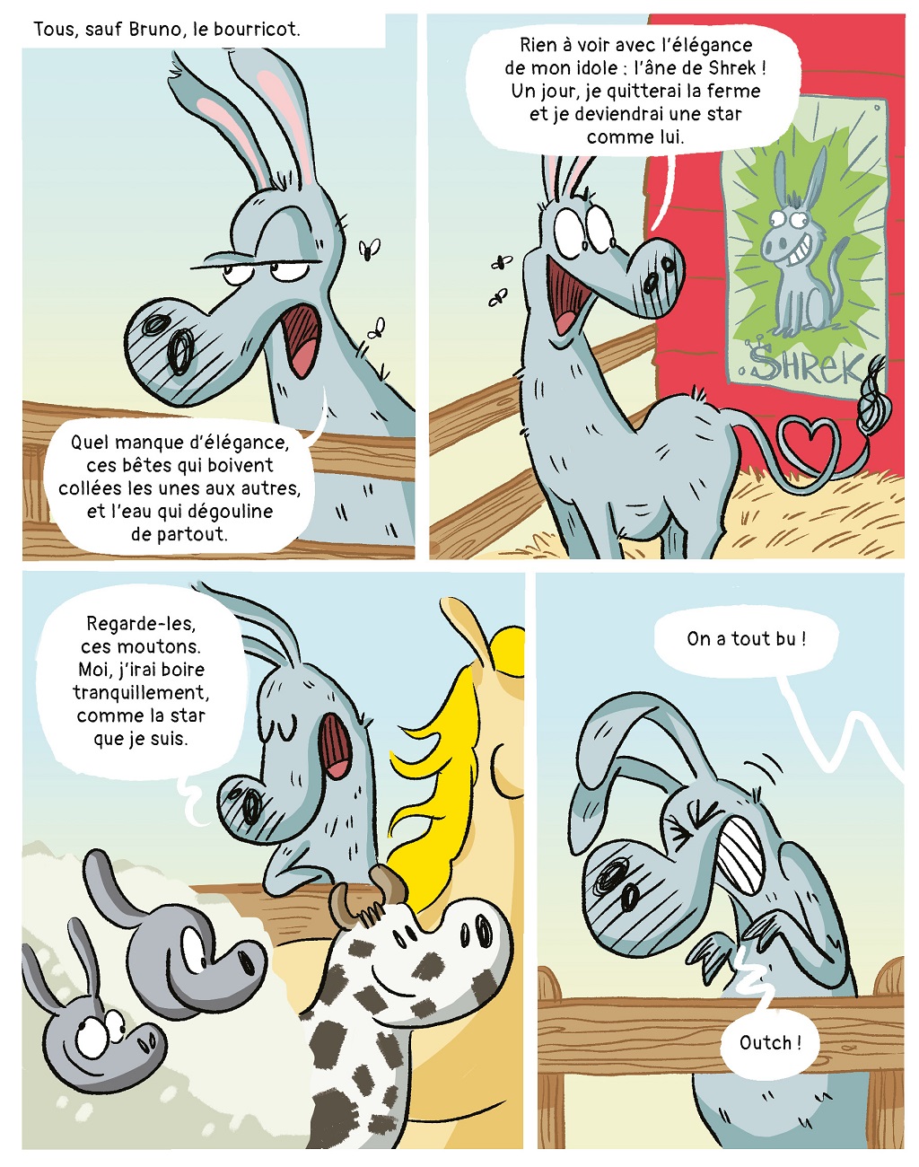 L’âne rêveur réussit à tromper les nombreux spectateurs avec sa panoplie de licorne. Tout le monde ou presque ! La petite Frida, qui comme ses camarades adore le spectacle des animaux fantastiques, n’est pas convaincue par ce Bourricorne et entend bien le démasquer. Son enquête, malgré tout bienveillante, finit par déciller le regard de Bruno sur ses partenaires de scène. Il comprend alors quel animal de la ferme se cache derrière Pégase, le flamboyant Phénix ou Cerbère, le chien féroce à trois têtes. Son moment de gloire est passé… ou pas !