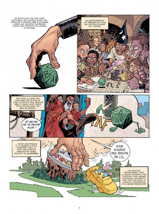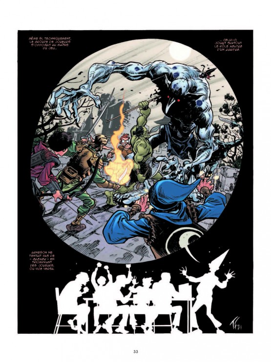Lui-même rôliste et auteur d’un supplément pour « L’Appel de Cthulhu », le scénariste Fred Van Lente, spécialiste de l’histoire des comics, alimente de toute sa verve ce documentaire foisonnant de détails et de références anglo-saxonnes (il faut lire les annexes pour mieux saisir les détails et les recherches effectuées par les auteurs). Au dessin, Tom Fowler, également scénariste et illustrateur pour des cartes ou JDR tels « Shadowrun », « Hell on Earth », « Star Wars » et « Men in Black », déploie un style semi-réaliste, aux tonalités et personnages volontiers acides ou décalés. Une ambiance potache et pour ainsi dire ludique, qui vient en contrepoint des contenus documentaires tout en nous rappelant l’essentiel : par-delà les principes de la narration collaborative, le JDR ne fonctionne que si tout le monde participe et s’amuse. Peu importe, dès lors, si la partie n’est qu’un porte-monstre-trésor d’un soir ou une campagne étalée sur des années…