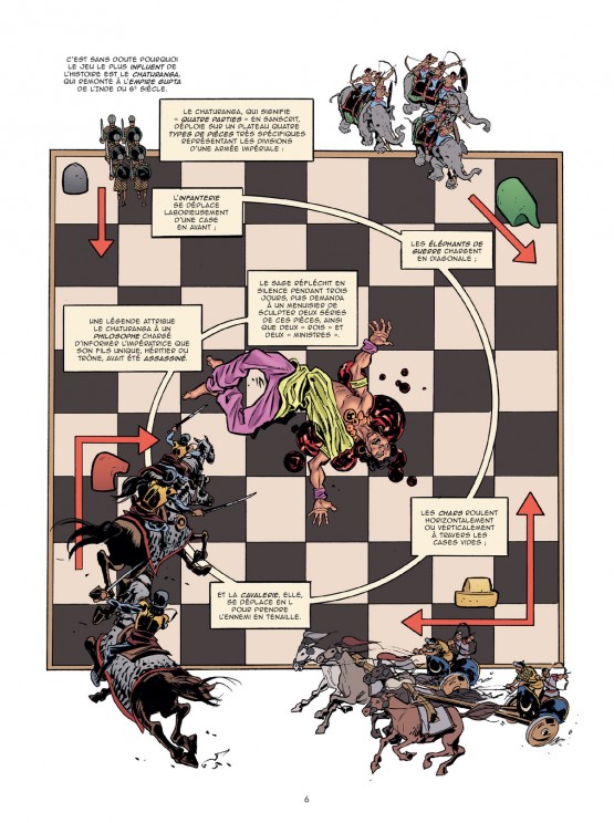 Déroulée au fil de huit chapitres chronologiques et thématiques (citons les explicites « La Guerre sans effusion de sang » ou « Le Triomphe des jeux de rôle papier »), l’album décrit non sans humour le destin (parfois très improbable…) de grands créateurs, devenus des personnalités associées au genre et plus largement à la pop culture. Parmi ces dernières : Gary Gigax (1938-2008) et Dave Arneson (1947-2009), les cocréateurs de « Donjons et Dragons » en 1974, ou Richard Garriott (né en 1961), fondateur en 1980 de la série de jeu de rôle sur ordinateur « Ultima ».