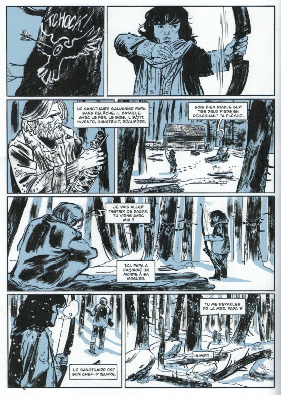 Un dessin plutôt léché (qui fait penser à celui de Michel Crespin) et, là aussi, une narration bien huilée sont au rendez-vous de cette histoire d’enfant-chasseresse qui va, elle-même, devenir proie dans un monde où un virus transmis par les oiseaux aurait balayé la quasi-totalité des humains… : c’est poignant, initiatique et poétique à la fois ! On applaudit…