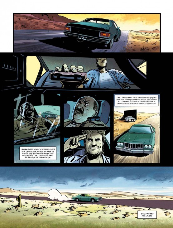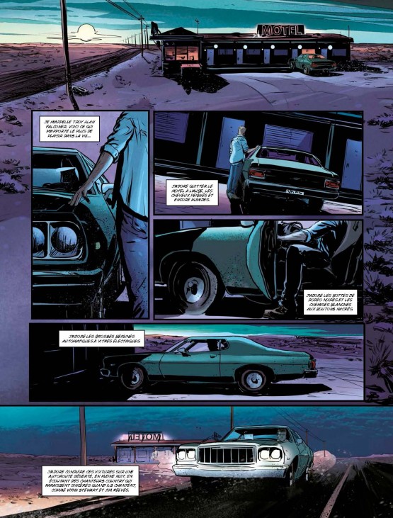 Une ciel sombre, une route noire qui disparait entre rochers et collines désertiques, un personnage isolé près d’une Ford Mustang et d’un panneau signalant l’arrivée dans l’État du Texas. Autant d’éléments visuels qui, au-delà du titre « Presidio » (du nom d’une ville située à la frontière entre États-Unis et Mexique), démultiplient les références aux genres et à leurs codes. Au choix : le polar, l’aventure, le western, le road-movie, voire le fantastique (avec son climat d’incertitudes, son ciel apocalyptique et son héros inquiet), il y en aurait presque ici pour tous les goûts. Si ce n’est que l’observation plus précise de l’ensemble des indices réduit in fine le champ d’investigation à un seul et unique genre : le thriller, sous-genre policier slalomant ici et tel que l’avons souligné entre road-movie et tonalités hard-boiled. À ceci près, naturellement, que Troy Falconer n’est point un détective, mais un marginal, évoluant dans des espaces – petites villes, diners et autres déserts – plus ou moins déshumanisés. Dans ce sombre décor de perdition, notre Falconer/« fauconnier » (nom où se devine la référence au film noir et au « Faucon maltais ») cherche-t-il des proies, ou est-il lui-même en fugitif, fuyant une obscure menace ?