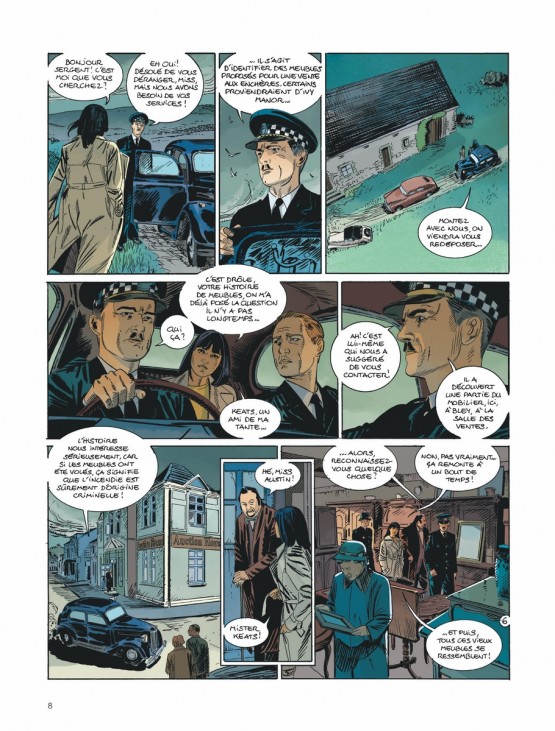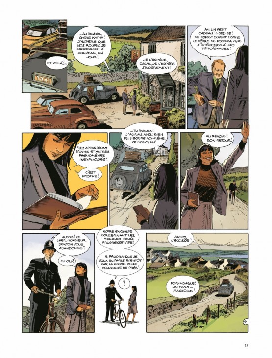 À ce titre, le dessin impeccable de Bertrand Marchal ravit l’œil : que ce soit dans sa description des paysages écossais, des gens ordinaires croisés au port ou dans les pubs, ou des voitures d’époque (fin des années 1940). On mesure le travail fourni pour cette reconstitution qui sent bon l’authenticité, aux personnages justes. Un mot sur les couleurs de Sébastien Bouët, qui, après « Lady S » et tant d’autres, confirme un savoir-faire unique, à la colorisation sobre, mais très expressive. Cet album un peu plus long que les précédents (52 planches), comme souvent en clôture, achève ce beau cycle du « trio de l’étrange ».