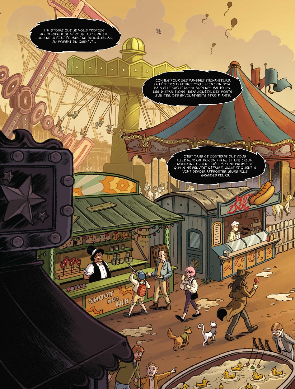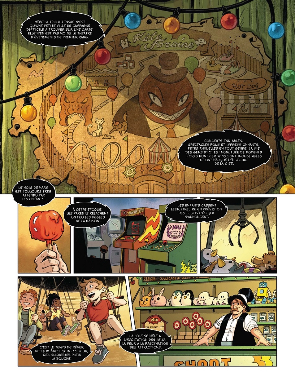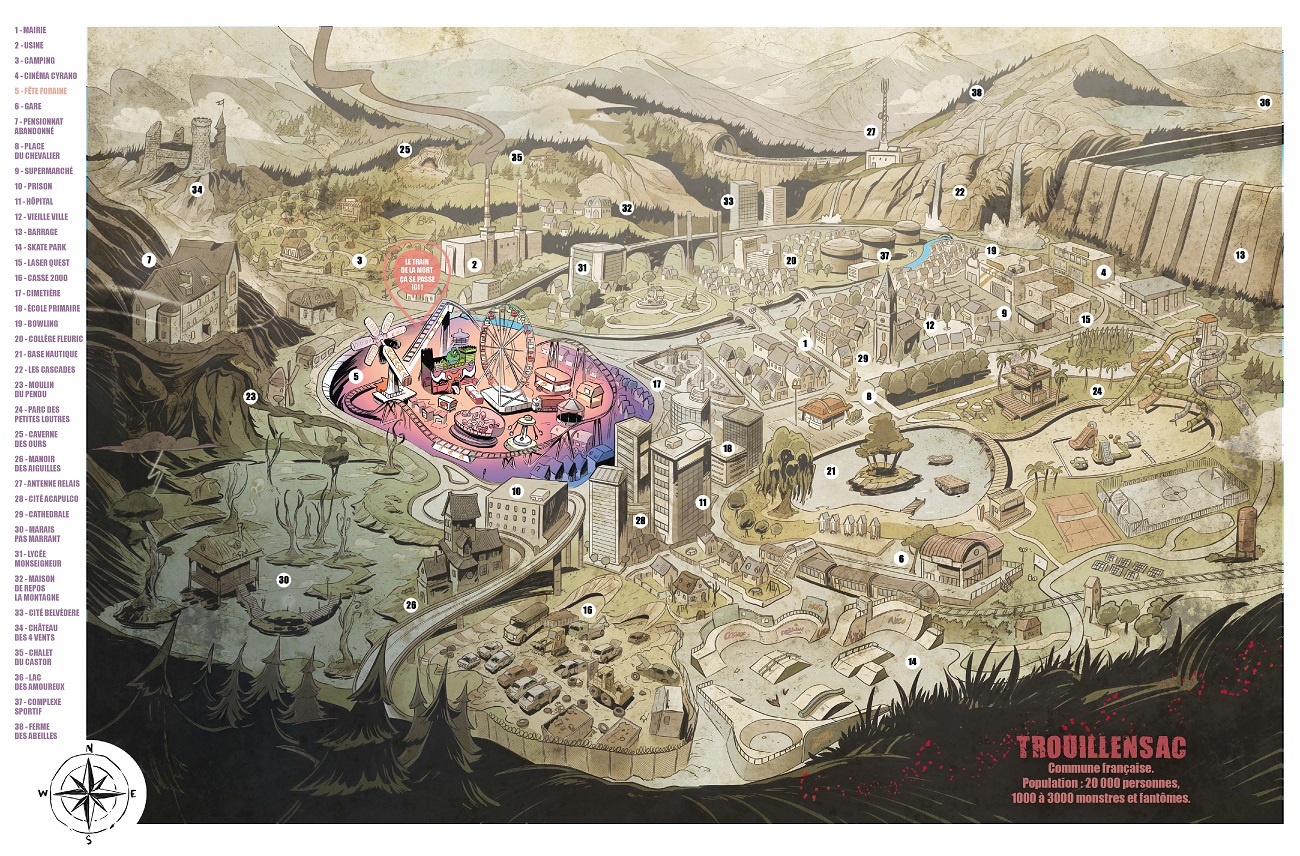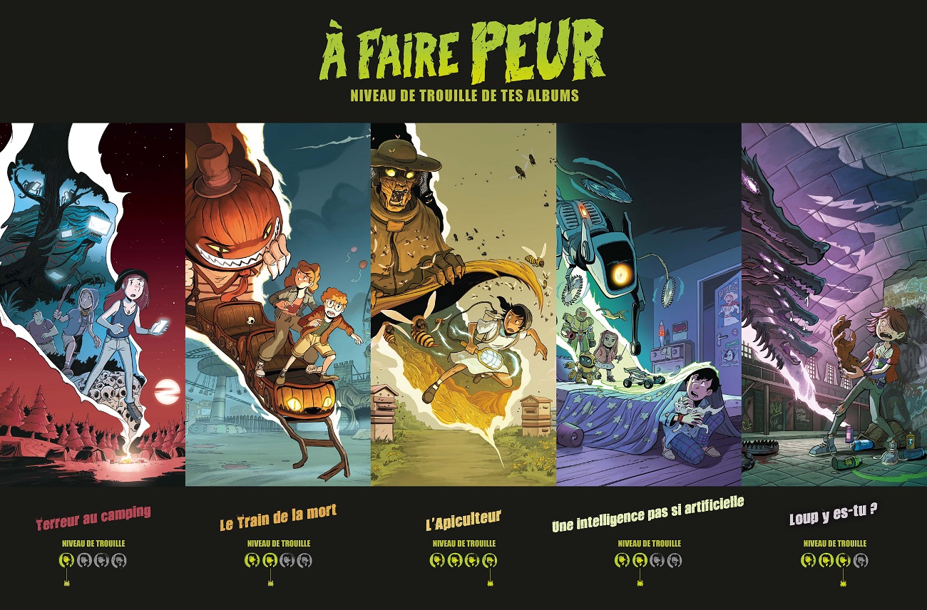 C’est déjà le deuxième volume de la collection À faire peur. Après « Terreur au camping », paraitront en juin prochain « L’Apiculteur », puis en octobre « Une intelligence pas si artificielle » et, en 2027, « Loup y es-tu ? ». Elle s’adresse à un jeune lectorat (dès dix ans) et adolescent qui aime se faire peur sans être toutefois traumatisé. Les auteurs jouent sur ce délicat équilibre en indiquant pour chaque récit le niveau de peur avant lecture sur un trouillomètre. Pour cet album, il est de deux sur quatre, mais attention ! Le suivant atteindra les quatre sur quatre ! Tous les volumes peuvent se lire indépendamment les uns des autres. Le lecteur attentif aura néanmoins le plaisir de retrouver certains personnages sur plusieurs récits. Ils peuvent ainsi passer de silhouette entraperçue à héros de l’aventure. L’univers présenté est cohérent, les intrigues se déroulent toutes dans la ville et ses environs cartographiés précisément en pages de garde.