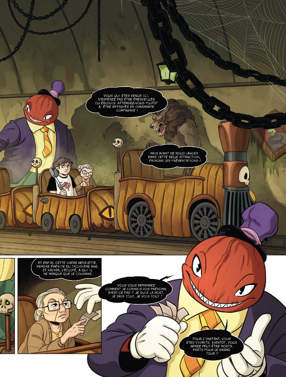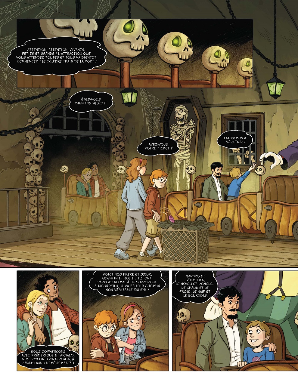 Quentin, son petit frère lui a promis de l’accompagner, mais il est bien peu rassuré avant d’embarquer avec des inconnus dans ce train fantôme particulier. Un être malfaisant au sourire sardonique conduit la locomotive factice vers une série de défis mortels où chacun devra sauver sa peau, quitte à sacrifier celle des autres. Suivant une morale, finalement très morale, ce tour de manège angoissant se finira mal pour l’un des passagers