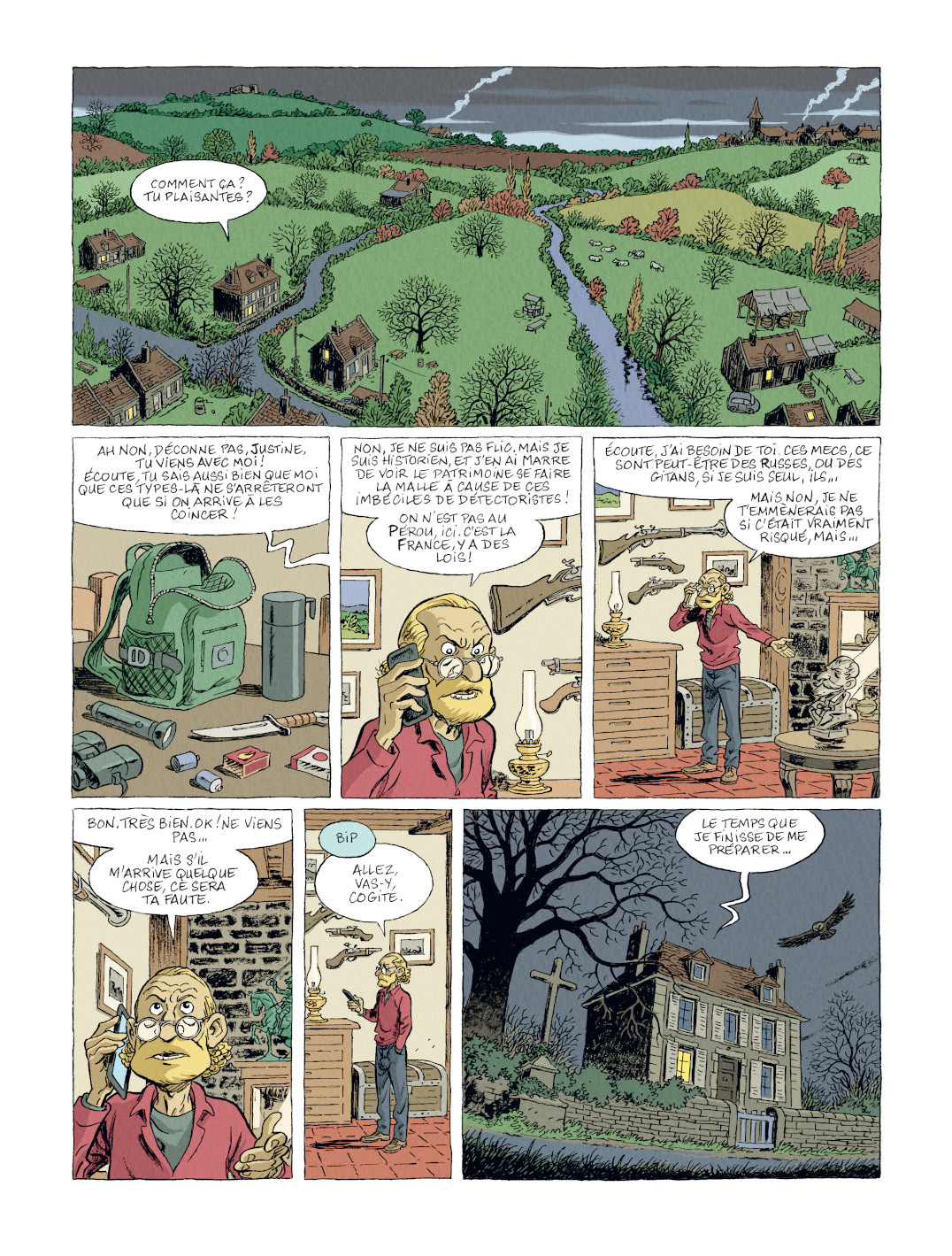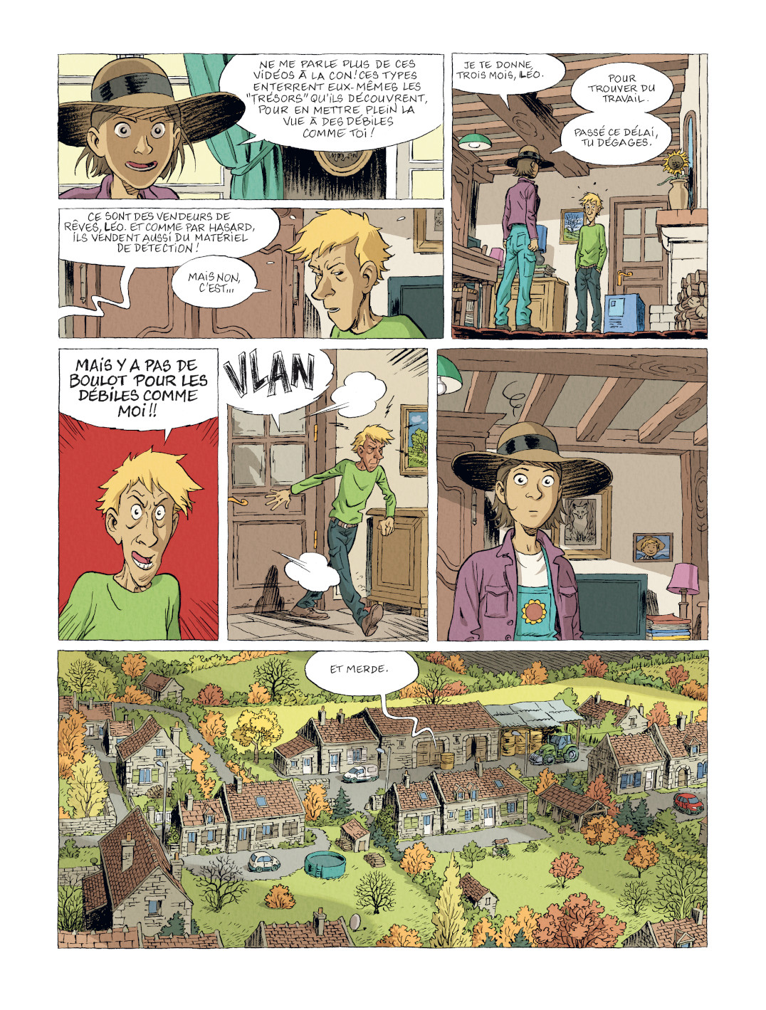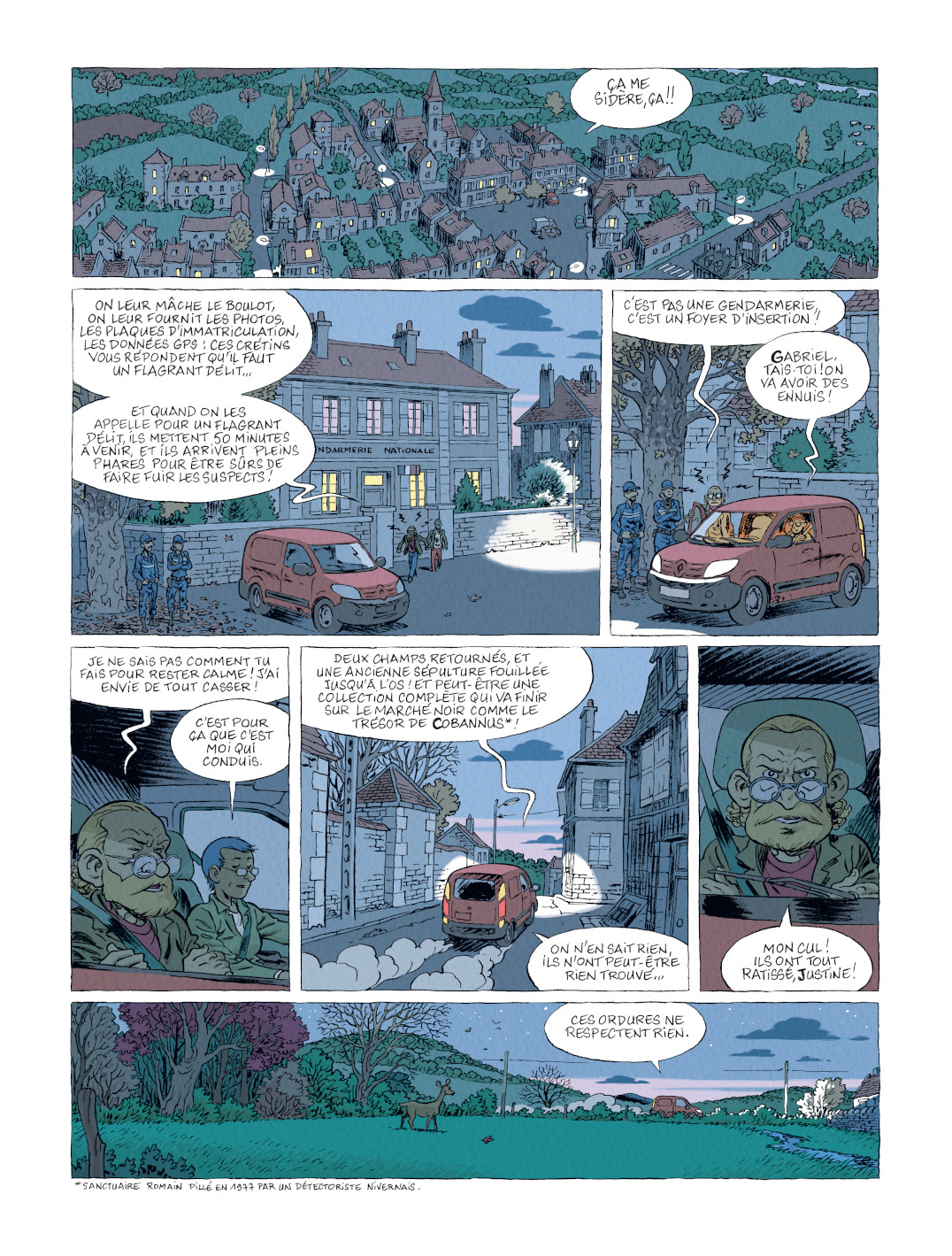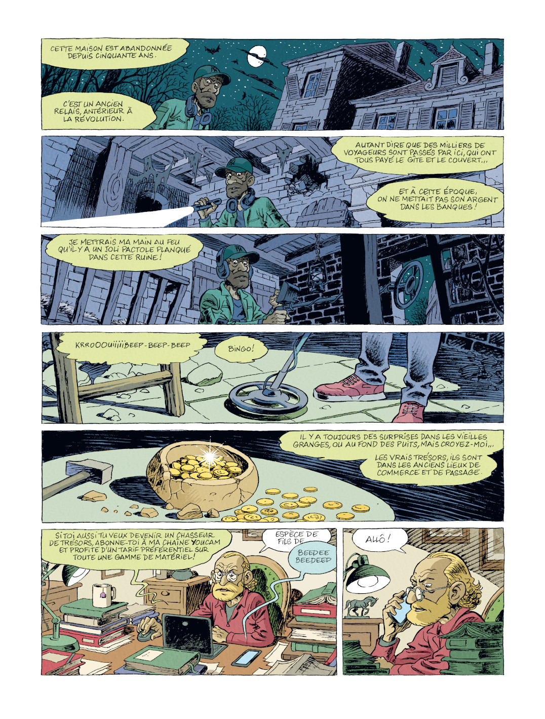 Poursuivant son rêve de môme, détecteur en main, le jeune homme part donc en quête d’un hypothétique magot et va s’aventurer, malgré lui et sans autorisation, sur un terrain de chasse situé dans une zone d’intérêt historique très encadrée. La représentation de la campagne nivernaise et la vie rurale — avec sa riche galerie de personnages aux trognes inoubliables — sont, d’ailleurs, quelques-uns des principaux attraits de cette bande dessinée un peu nostalgique, où l’auteur a manifestement mis beaucoup de lui : de ses doutes, de ses espoirs, mais également de ses afflictions.