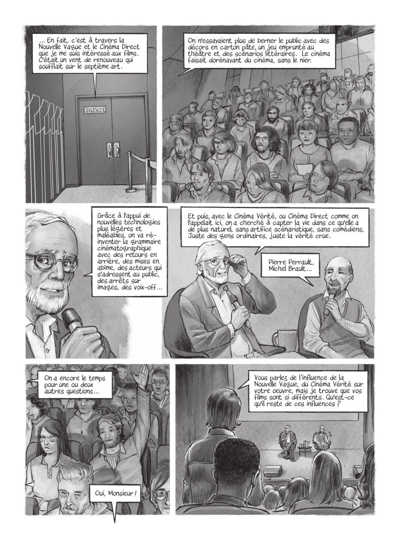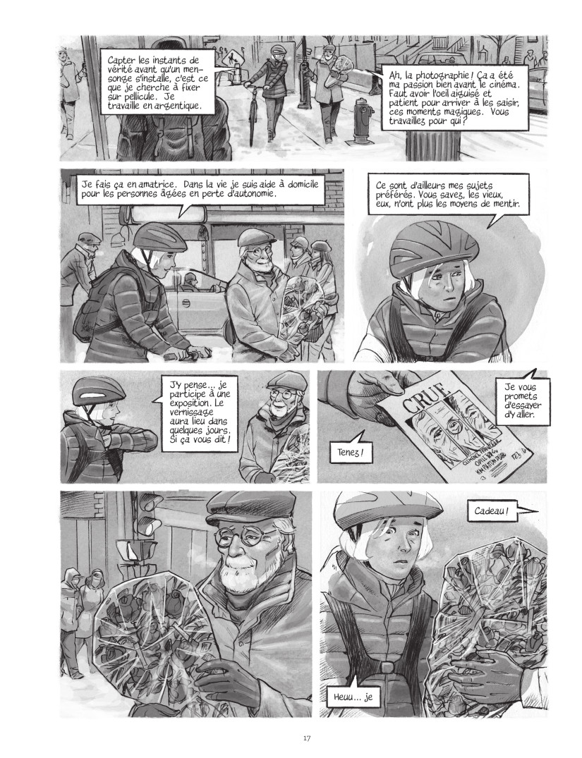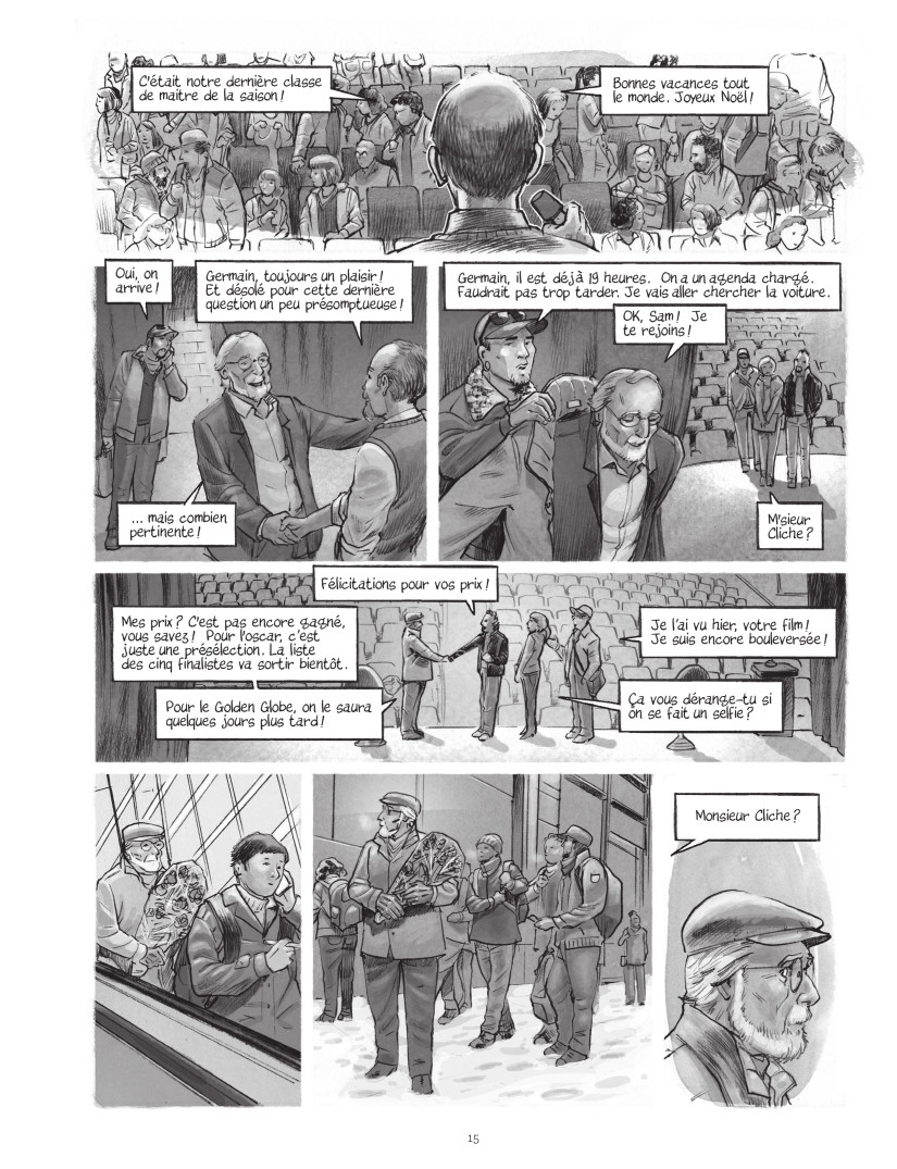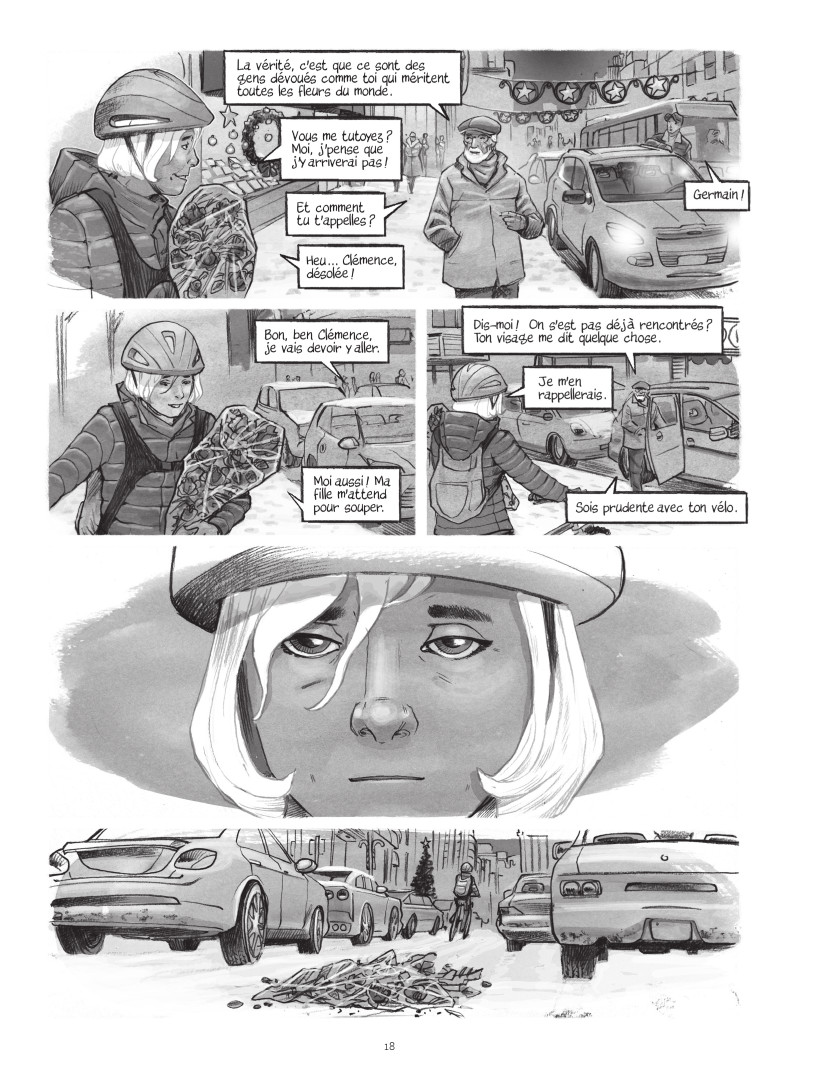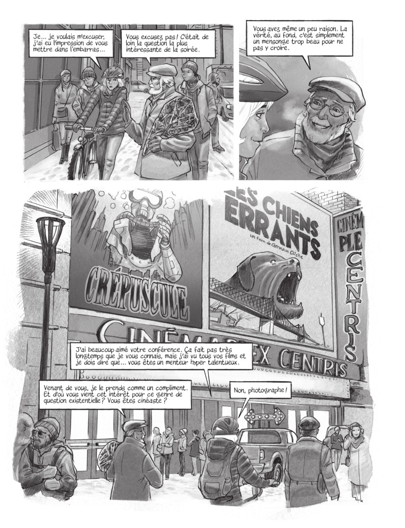 À partir de ce moment-là, le lecteur va se demander, continuellement, si Germain Cliche, personnage on ne peut plus ambiguë, est coupable ou pas… En effet, les 164 pages que comporte ce palpitant roman graphique sont composées narrativement comme un véritable thriller : Claude Paiement, par ailleurs auteur de théâtre et metteur en scène, maîtrisant parfaitement l’art du dialogue et du sens du rythme, ainsi qu’il l’avait déjà prouvé avec son partenaire dessinateur sur leurs précédents « Memoria » et « La Femme aux cartes postales ». (1)