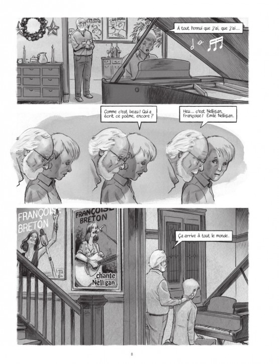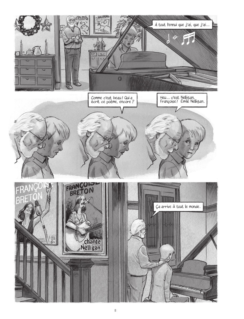 Quant au dessin élaboré de cette figure marquante de la bande dessinée québécoise qu’est Jean-Paul Eid — en plus de ses débuts dans le magazine Croc où il crée le personnage de Jérôme Bigras, on lui doit bien d’autres albums, dont « Le Petit Astronaute » salué par la critique et couronné de nombreux prix —, par sa pudeur et sa dextérité, il s’accorde parfaitement au propos à la fois intime et universel.