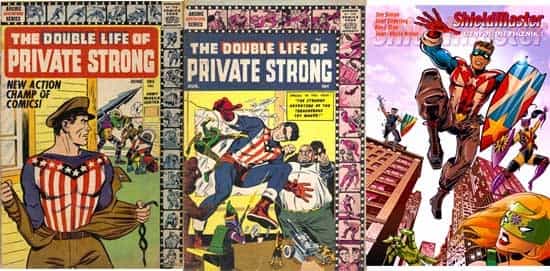 Curieusement, S & K collaboreront au « Shield » alias Private Strong de MLJ (dans le titre The Double Life of Private Strong) en 1959 (et dans les années 80, Simon développera ShieldMaster, un personnage assez proche, que son fils Jim Simon, les dessinateurs Reed Man & Jean-Marie Arnon et moi-même viennent d’adapter en album chez Organic Comix avec « ShieldMaster : l’envol du Phoenix ! »).