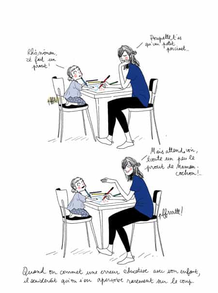 Margaux Motin : Techniquement, je suis toujours « en travail ». J’écoute, j’observe, je note, des couleurs, une attitude, une conversation. Je réfléchis à la façon dont je peux m’en servir. Toutes mes notes sont issues de situations réelles, je cherche juste le ressort comique, ou sensible depuis peu, pour en faire quelque chose qu’on a envie de lire jusqu’au bout. Jusque là, je bossais à l’arrache, sans anticiper, parfois cinq heures d’affilée, le soir, quand je tenais une idée. Mais je ne peux plus. Je passe à côté de plein de moments de vie en bossant comme ça. Du coup j’ai décidé de consacrer une journée par semaine au blog, pour encrer et mettre en couleur mes crayonnés, découper les histoires, finaliser, et de mieux m’organiser pour caler mon travail d’illustratrice sur les 4 jours restants. Oui je sais ça laisse deux jours vacants. Paraît qu’on appelle ça « le week end », un concept que j’ai bien envie de me réapproprier !