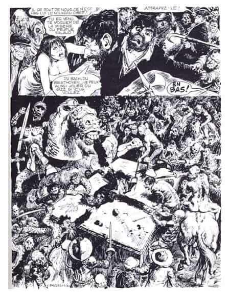 Quelqu’un qui consulte l’ensemble de la série ne peut que constater que Raoul Buzzelli a donné le meilleur de lui-même au début, puis a baissé de plus en plus. Son encrage, d’abord, se relâche, puis c’est le dessin. À la fin, c’est catastrophique, il n’en peut plus, il est au bout du rouleau et il y a du drame dans cette chute. Raoul se suicidera et Guido racontera combien son frère avait mal vécu ses désillusions artistiques. Dans le texte que j’ai livré aux éditions Delcourt, j’avais écrit : « Il aura le défaut de se laisser aller à bâcler après quelque temps ». Pour de bêtes raisons commerciales, il a été ajouté à ma phrase un « parfois ». Ce mot vise à faire croire que le niveau de la série va se maintenir en dépit de faiblesses passagères. C’est un mot de publicitaire, mais pour l’historien (et pour tout lecteur) les faits sont là : Raoul Buzzelli n’a pas « parfois » bâclé. Il a commencé plein d’espoir et il s’est peu à peu effondré, irréversiblement, et c’est bien triste.