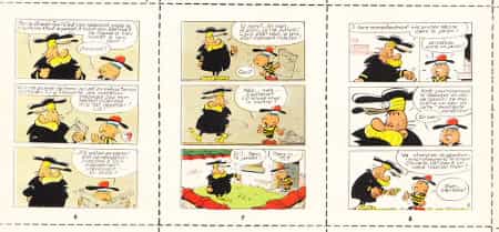 (5) Les cinq autres épisodes de « Monsieur Bonhomme » (8 planches de « Le Poteau qui tape » au n°11 de 1973 ou n°10 de l’Hebdotimiste français, 7 de « Narcotic Bureau » au n°22 ou n°21 français, 14 de « Palais des glaces » aux n°27 et 29 ou n°26 et 28 français, 15 de « Point limite : zéro » aux n°40 et 41 ou n°21 français et 7 de « Un si joli petit bois » au n°26 de 1974 ou n°77 français) ont fait l’objet d’un album broché en noir et blanc aux éditions Crocodile, en 1979. Ils ont également été repris en deux opus cartonnés et en couleurs chez Magic Strip, en 1983, lesquels sont complétés par les cinq gags de 2 pages scénarisées par Vicq (parus aux n°21, 23, 29, 31 et 37 de 1974 ou n°77, 83, 84, 86 et 92 français) : le tout étant bien sûr épuisé depuis belle lurette ! À noter, enfin, que Marc Wasterlain a travaillé sur trois nouvelles histoires complètes de « Monsieur Bonhomme » destinées à Je Bouquine, vers 1985 : mais le projet est finalement tombé à l’eau !