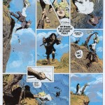Page 46, 44ème planche : après avoir échappé plusieurs fois à la mort en poursuivant son ennemi juré, ravisseur de sa femme et de son fils, Thorgal a rejoint le fourbe Shardar et le menace de son arc : ceci au moment même où Aaaricia, pourtant ligotée au-dessus du vide, a réussi à lui faire un croche-pattes. Ainsi débute la chute, dans une 1ère case en contre-plongée où se distinguent uniquement les éléments primordiaux : le haut de la falaise rocheuse, le ciel bleu, le corps déséquilibré du tyran (lequel vient d’échapper son couteau) et la blanche jeune femme, toujours attachée par les bras à une souche au-dessus de l’abîme. Naturellement, la forme verticale de la vignette intensifie la rapidité de l’action en cours.