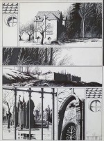Planche 17 : l’ensemble de la page, composé de 7 cases, est entièrement nocturne et silencieux. Dénué de personnages et de paroles, mais non de textes (on lira « Sambre au clair la Lune te regarde » sur le fronton de la chapelle familiale à l’avant-dernière case), l’ensemble résonne tel un écho à la planche 5, qui vit précisément la première rencontre entre le héros Bernard Sambre et l’étrange braconnière aux yeux rouges Julie. Les deux amoureux se sont fixés rendez-vous à minuit (planche 9, case 5) en un lieu tenu secret, que le lecteur découvre donc pour la première fois sur la présente planche. Suivons le mouvement de caméra omniscient suggéré par Yslaire : partant de l’œil-de-bœuf éteint situé sous les combles de la bastide elle-même plongée dans la nuit (cases 1 et 2), nous suivons sous une Lune blafarde le chemin serpentant entre les herbes (case 3), lequel nous mène jusqu’à l’enceinte du cimetière (case 4). Ainsi s’installe peu à peu une dramaturgie morbide et fantastique, cette fois-ci plus proche des écrits d’Aloysius Bertrand (« Gaspard de la nuit », 1842), d’Hoffman ou de Nodier, dans la mesure où l’action se circonscrit dans un périmètre étroit (entre la bastide et le cimetière) qui semble étouffer l’ensemble des protagonistes. Sous un cercle céleste lumineux venu irradier la transgression, nous voici devant les grilles du néant (case 5), près à passer vers le territoire où reposent les morts : cette violation du sacré à l’angle des amours interdites annoncées ne laisse rien présager de bon… Univers surnaturel teinté de noirs, de gris et de sépias, en contraste avec les rouges du désir, de la passion (adolescente ou révolutionnaire) et du sang, celui de « Sambre » transporte en permanence le thème de la blessure à l’œil, du regard biaisé et de l’aveuglement. Case 6, sans détour et sans masquer ses intentions (selon le sens de l’expression « Sabre au clair », ici déviée en « Sambre au clair de Lune… »), le héros tragique (toujours invisible) s’apprête bel et bien à commettre l’irréparable. Contrairement à ce que pense cependant le lecteur, à ce moment du récit, ni Bernard ni Julie ne sont encore réunis (ce sera le cas à la planche 23)… Ultime ellipse, en guise d’ouverture/fermeture, la case 7 s’illumine : nous y retrouvons l’œil-de-bœuf symbolique de la bastide, motif répété selon la figure de style littéraire nommée épanadiplose. C’est là que Sarah Sambre désire comprendre, transcrire et parachever l’ouvrage « La Guerre des yeux » (planche 18), nous exposant inexorablement à la compréhension du poids du passé, à la quête des origines et aux choix historiques. Toutes choses méticuleusement travaillées par les auteurs, non seulement dans les 3 ouvrages venant compléter ce premier cycle (publié de 1986 à 1996), mais aussi dans deux cycles suivants (prévus en 8 albums couvrant les années 1856 à 1871) et dans la série dérivée « La Guerre des Sambre » (débutée en 2007 avec Jean Bastide et Vincent Mezil ; 12 albums prévus au total, en remontant les époques jusqu’en 1789 et la Préhistoire).