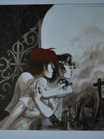 La saga « Sambre », incontestable, chef-d’œuvre de la bande dessinée contemporaine, fut initiée par Balac (pseudonyme du prolifique scénariste Yann Le Pennetier) et Yslaire, un dessinateur à l’époque déjà connu pour « Bidouille et Violette », série publiée chez Dupuis dès 1978. Dès le 1er tome (« Plus ne m’est rien… » est publié en album chez Glénat en juin 1986), les lecteurs découvrent un drame romantique aux graphismes envoûtants et dans lequel se devinent les inspirations littéraires tour à tour balzaciennes, hugoliennes et shakespeariennes. Le contexte est celui des prémices de la Révolution française de 1848, dirigée contre Louis-Philippe en raison de grandes difficultés politiques et financières, des mécontentements ouvriers et des risques sanitaires (disette et épidémie de choléra dévastatrice à partir de 1832). Alors que son vieux père vient de mourir en laissant inachevé un mystérieux ouvrage intitulé « La Guerre des yeux », Bernard Sambre tombe amoureux de Julie, une braconnière aux yeux rouges née d’une mère prostituée à Paris. Les deux s’uniront en secret, par une sombre nuit de pleine lune, dans le caveau des Sambre (voir la couverture proposée), scellant ainsi leurs propres amours au seuil d’une destinée tragique digne de « Roméo & Juliette ». Car tout laisse en effet deviner que la « race maudite » au regard de sang creuse la vengeance et la malédiction des Sambre, tel que le devine Sarah – la sœur de Bernard – en tentant de retranscrire les brouillons du père disparu, Hugo Sambre…