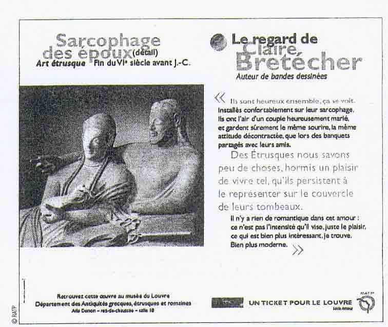 Véritable coup double pour Claire Bretecher qui au début de l’année nous souhaitait, au nom de la RATP, une bonne année 2004 avec –avec beaucoup d’amûûûr et qui revient en grande forme pour cette nouvelle opération.. Un partenariat qui jette un pont entre des personnalités d’univers et de siècles différents et qui permet de rapprocher des œuvres d’art historiques des émotions et de la sensibilité d’aujourd’hui. CM