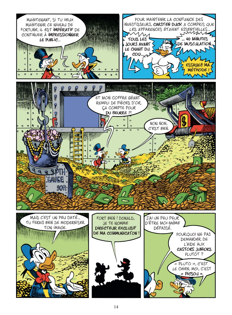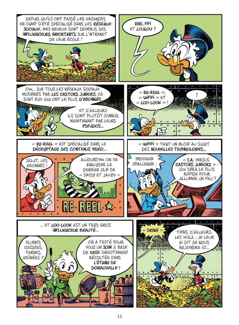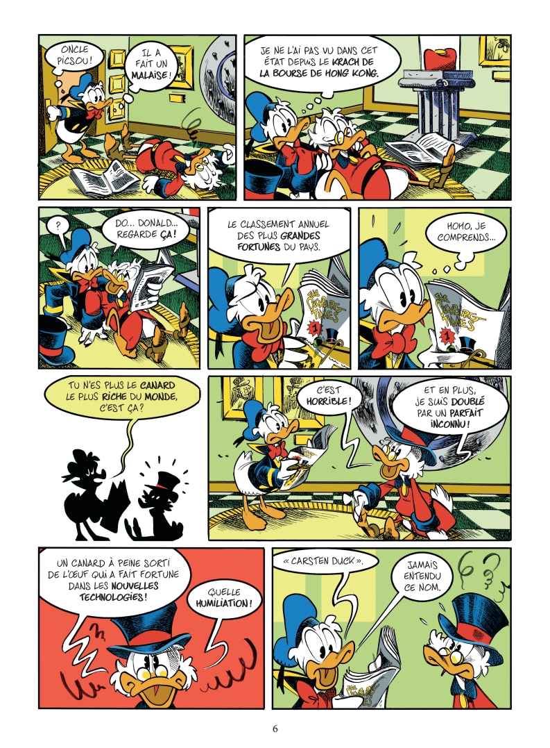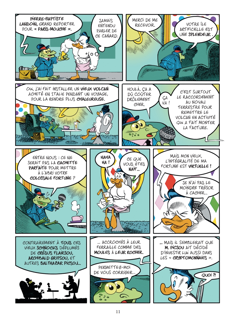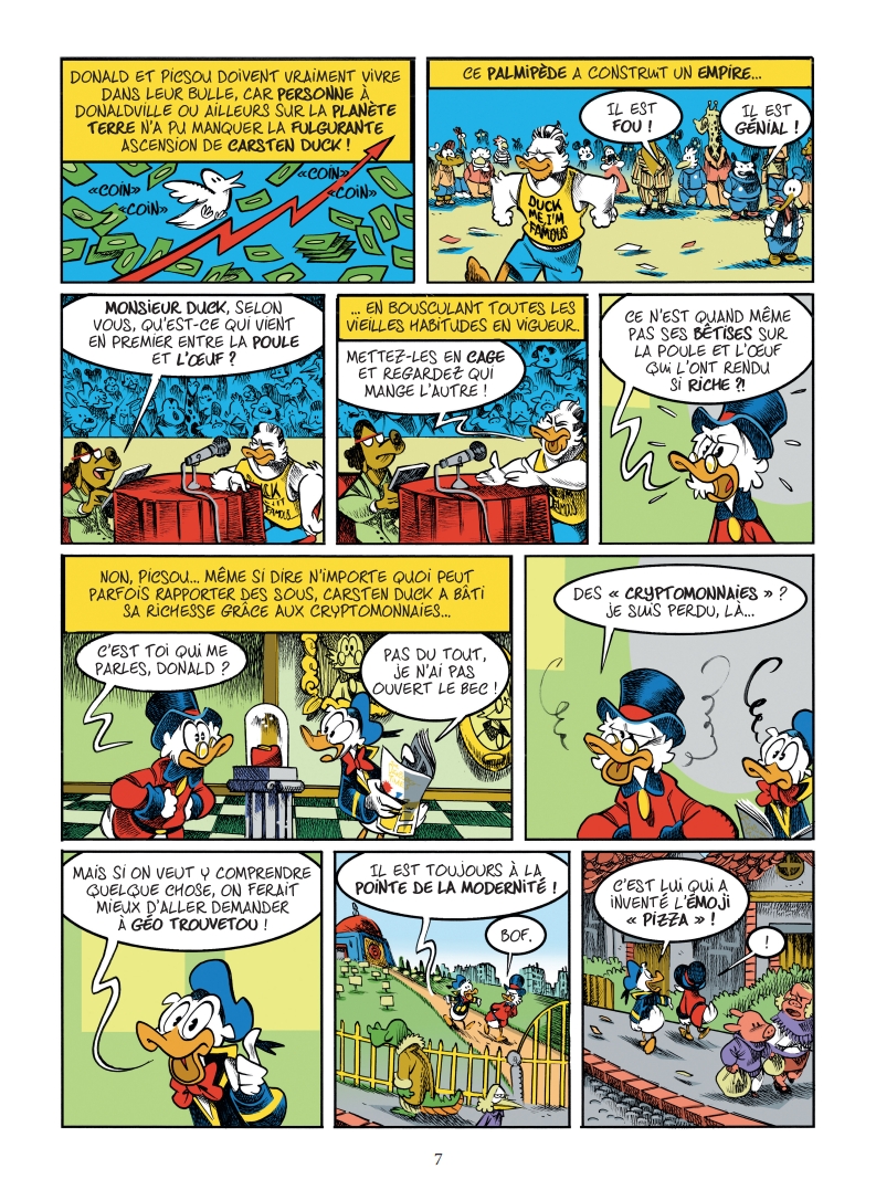 Après s’être entrainé à la reprise d’un autre héros culte, entre transgression, respect et insolence, avec les albums de « Lucky Luke » il y a 12 ans déjà, Jul s’est approprié toute la galerie de personnages des aventures de Picsou, mais en les faisant évoluer dans une société du XXIe siècle. De quoi s’amuser des lubies de certains milliardaires de la tech : les références à Elon Musk sont claires, de l’influence des réseaux sociaux et des influenceurs de tous poils, ainsi que des mystères des fortunes bâties sur les cryptomonnaies.