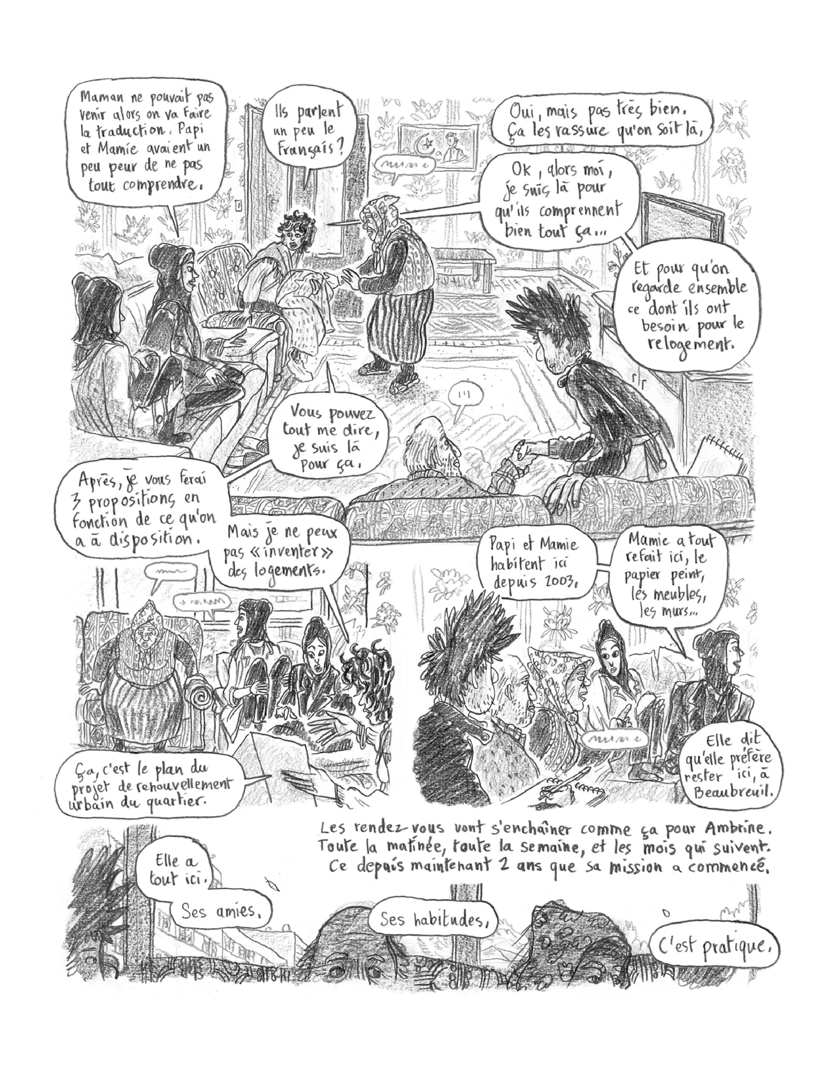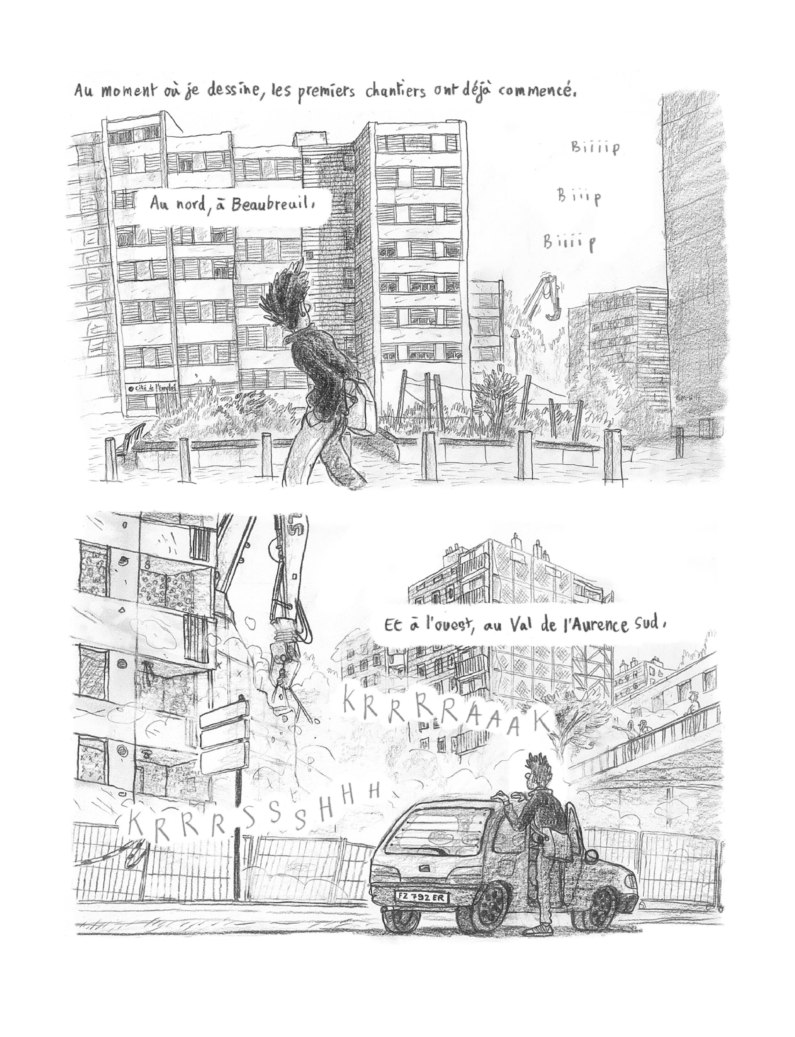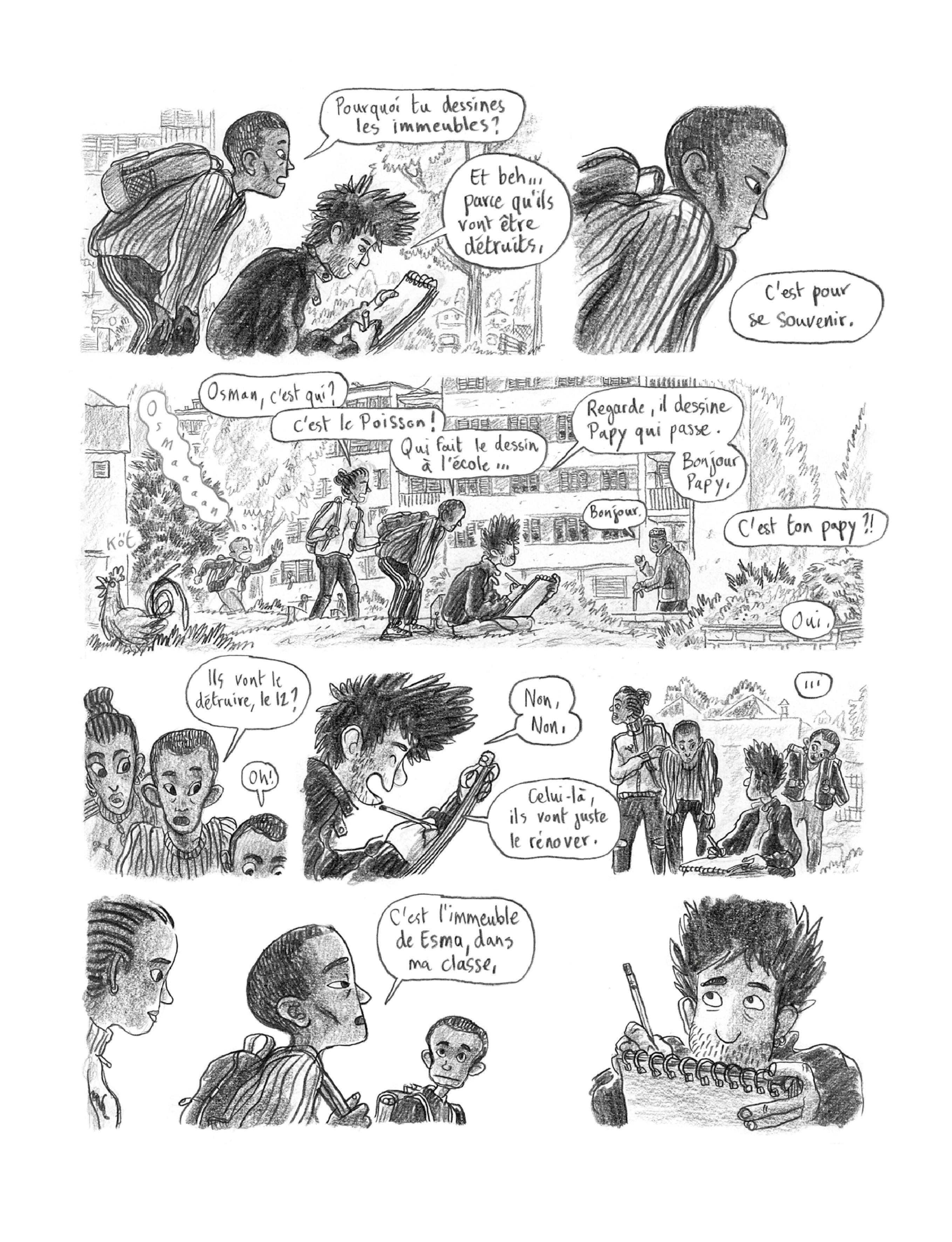 De septembre 2023 à mai 2025, Le Poisson enquêta sur ces deux quartiers, en rencontrant et interrogeant les personnes qui y vivaient et y travaillaient. Pour cela, il fut aidé par les équipes mises en place par les bailleurs sociaux, afin d’accompagner les habitants vers les transitions mises en place. La pratique du dessin in situ fut aussi un élément important de la prise de contact avec la population.