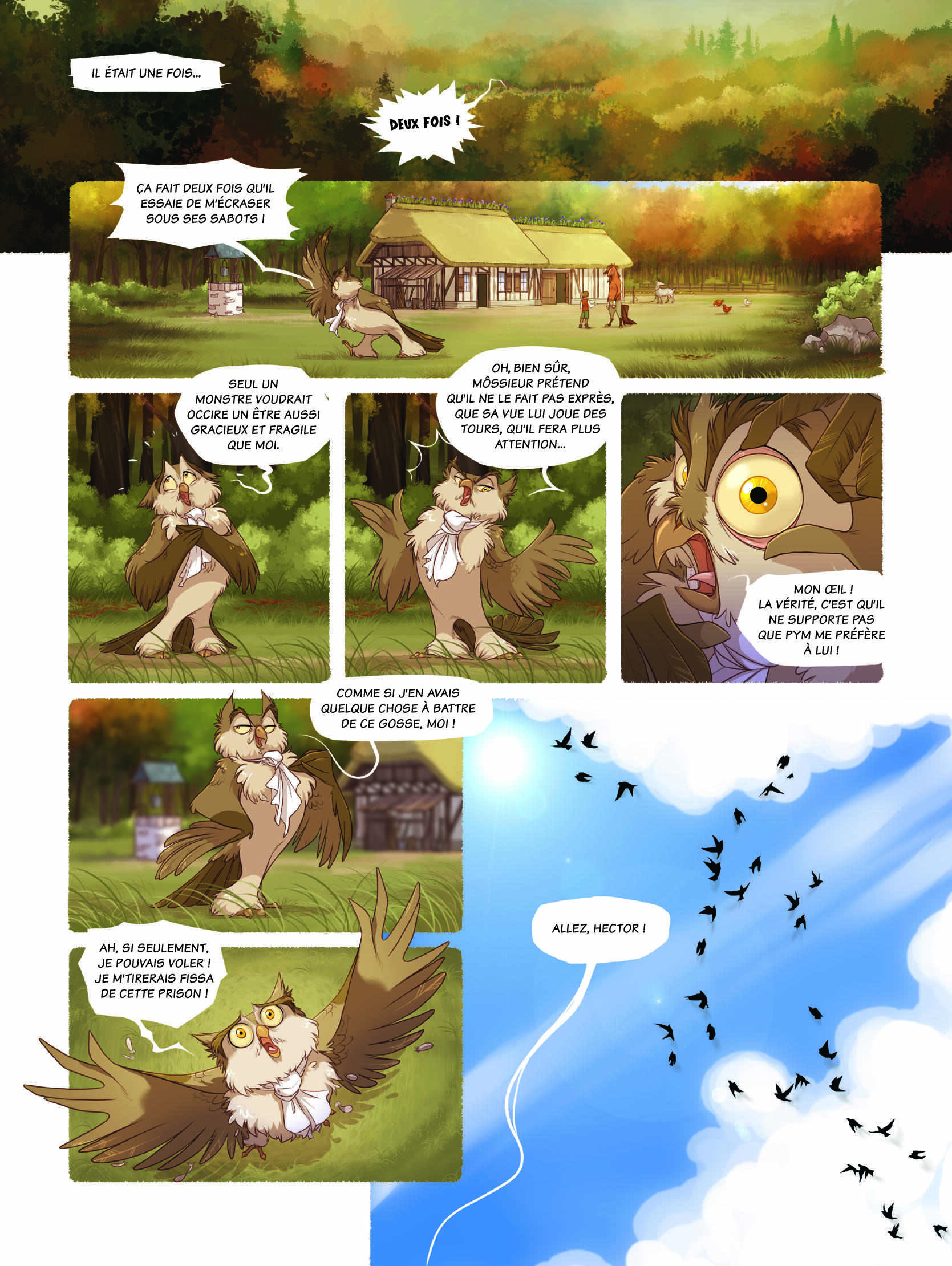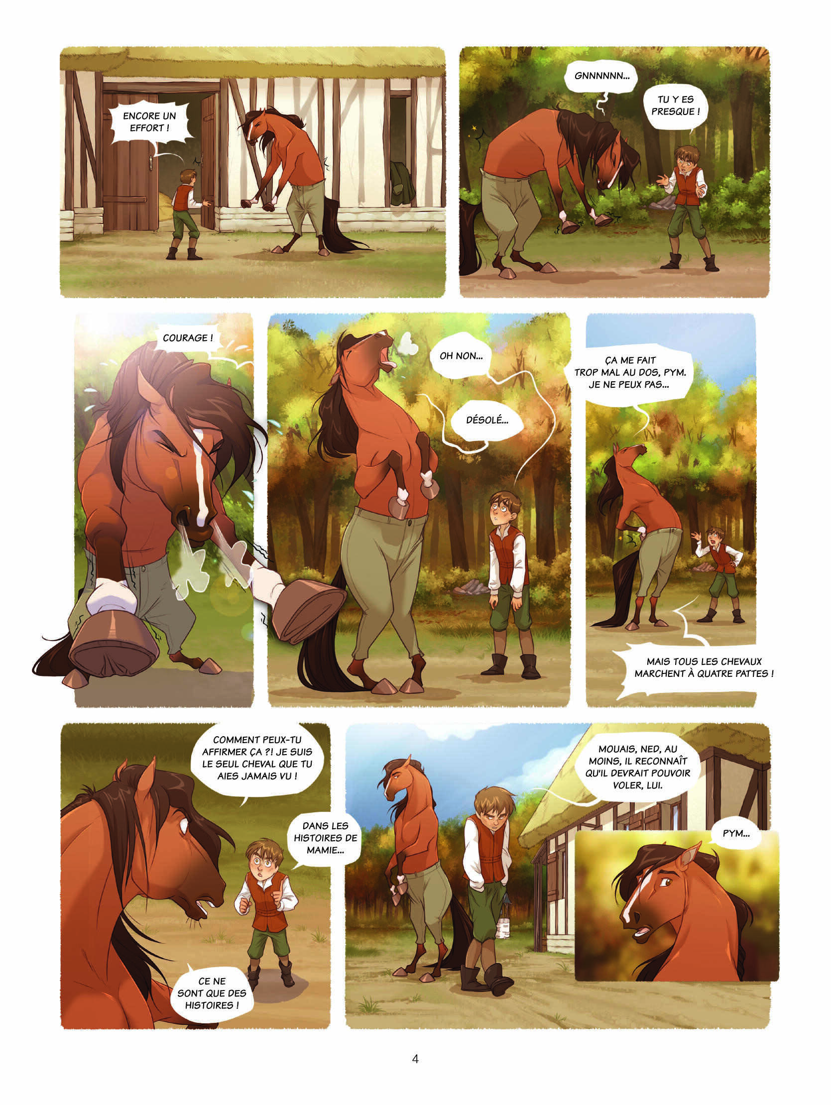 Il nous reste un peu de temps pour évoquer un autre album jeunesse de grande qualité des éditions Dupuis : le premier volume de « Pym et la forêt éternelle ». Dans ce conte médiéval, Pym est un enfant qui grandit dans une clairière seulement entourée de sa mamie, d’un hibou bavard incapable de voler et d’un cheval bipède d’un naturel taciturne.