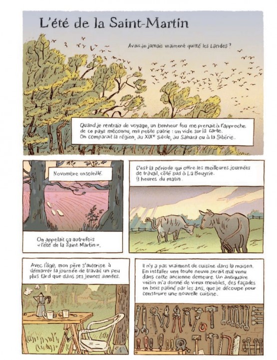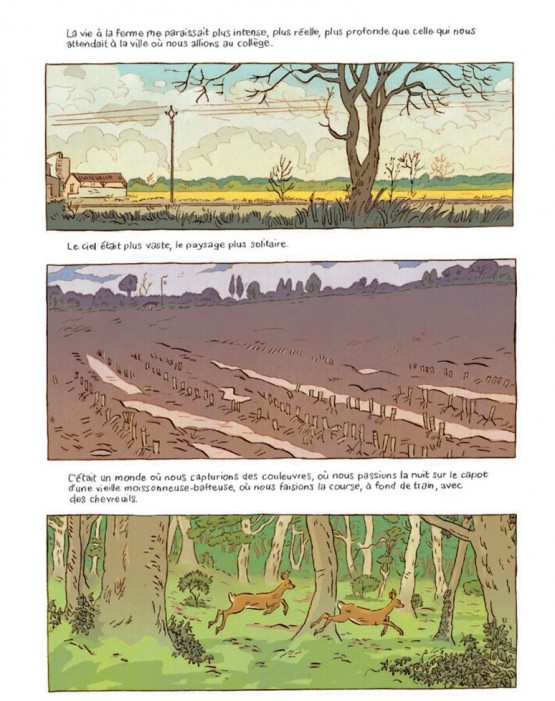 Se laisser absorber par la beauté de la lumière au petit jour, faire le tour du terrain pour vérifier que tout est en ordre, partager une terre hospitalière, cultiver le champ tout autant que son esprit, comprendre que tout le monde mange tout le monde, se confronter à d’autres formes de responsabilité… Si les messages abondent dans « J’ai toujours rêvé d’être un fermier », ils sont délivrés au fil des pages avec une douceur et un caractère raisonné. En racontant le quotidien et le passage des saisons, autour de la rénovation de cette maison de laboureur, le récit se fait essentiellement attentif aux choses. C’est la grande force de l’ouvrage, qui s’inscrit comme une ode sensible à la nature, sans militantisme. Un album dans la veine des œuvres de Rousseau, Zola (« La Terre »), Pagnol (« L’Eau des collines ») et Giono (« Regain », « L’Homme qui plantait des arbres ») ; en bande dessinée, d’Étienne Davodeau (« Les Ignorants », 2011) au duo Troubs/Edmond Baudoin (« Le Goût de la terre », 2013) en passant, humour compris, par Didier Tronchet (« Tous à la campagne ! », 2024) et Manu Larcenet, avec son désopilant « Retour à la terre » (2002).